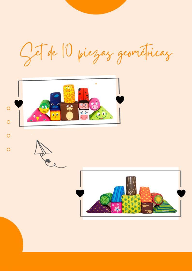 3 Cilindros de 8x6 de diámetro, 2 prismas de 12x6 cmts., 2 cuñas de 12x8 cmts., 2 triángulos de 8x6 cmts y un rectángulo de 12x6. Fabricados en jersey de seda estampada, con dinosaurios para libre asociación.