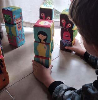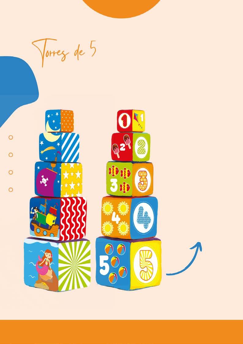 Torre de 5 cubos blandos decrecientes, altura 50 cm., con 5 números, tramas y figuras para contar y vincular a los números.