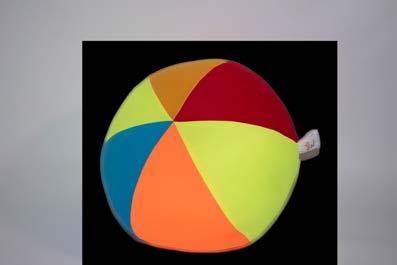 Pelota compuesta por una pelota con elástico, cintas coloridas y gancho para colgar, rellena con vellon siliconado y sonidito.