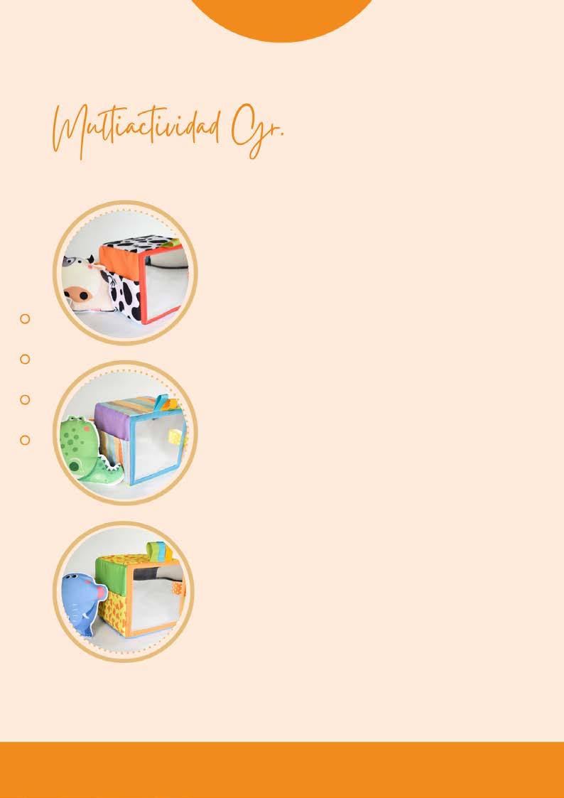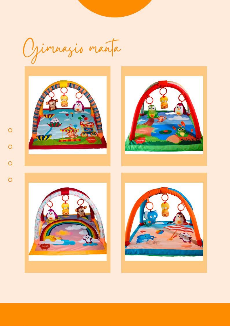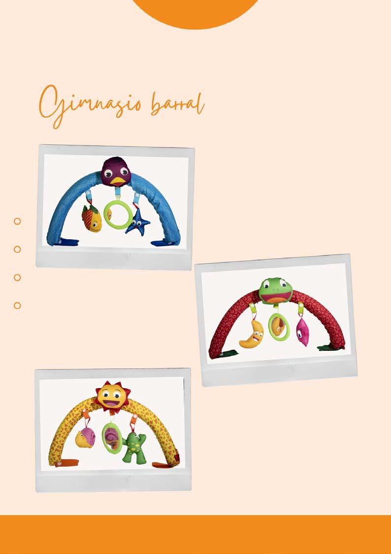 Manta de 0,80 x 0,80 mts. y gimnasio con actividades, dos barrales desarmables, tres personajes colgantes con cascabel.