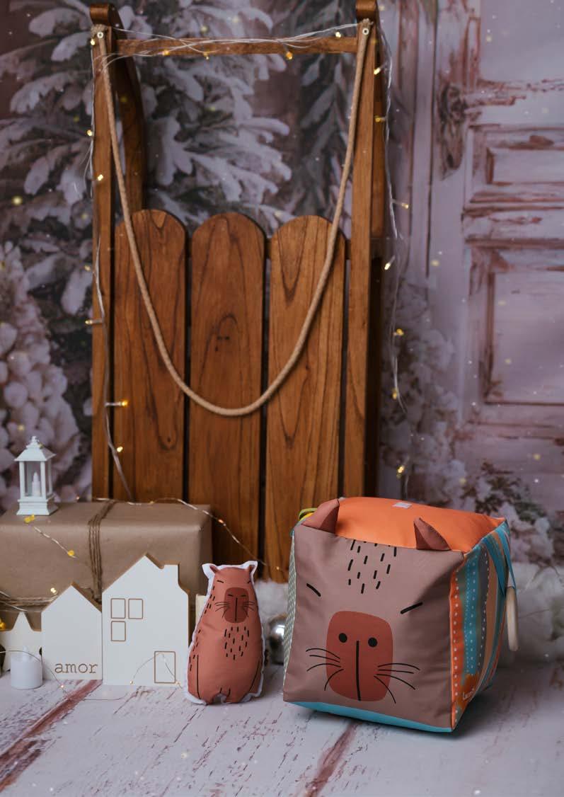 Cubo hueco de 20x20x20 con 3 muñecos, fabricados en jersey de seda, rellenos de vellón siliconado con sonidito.