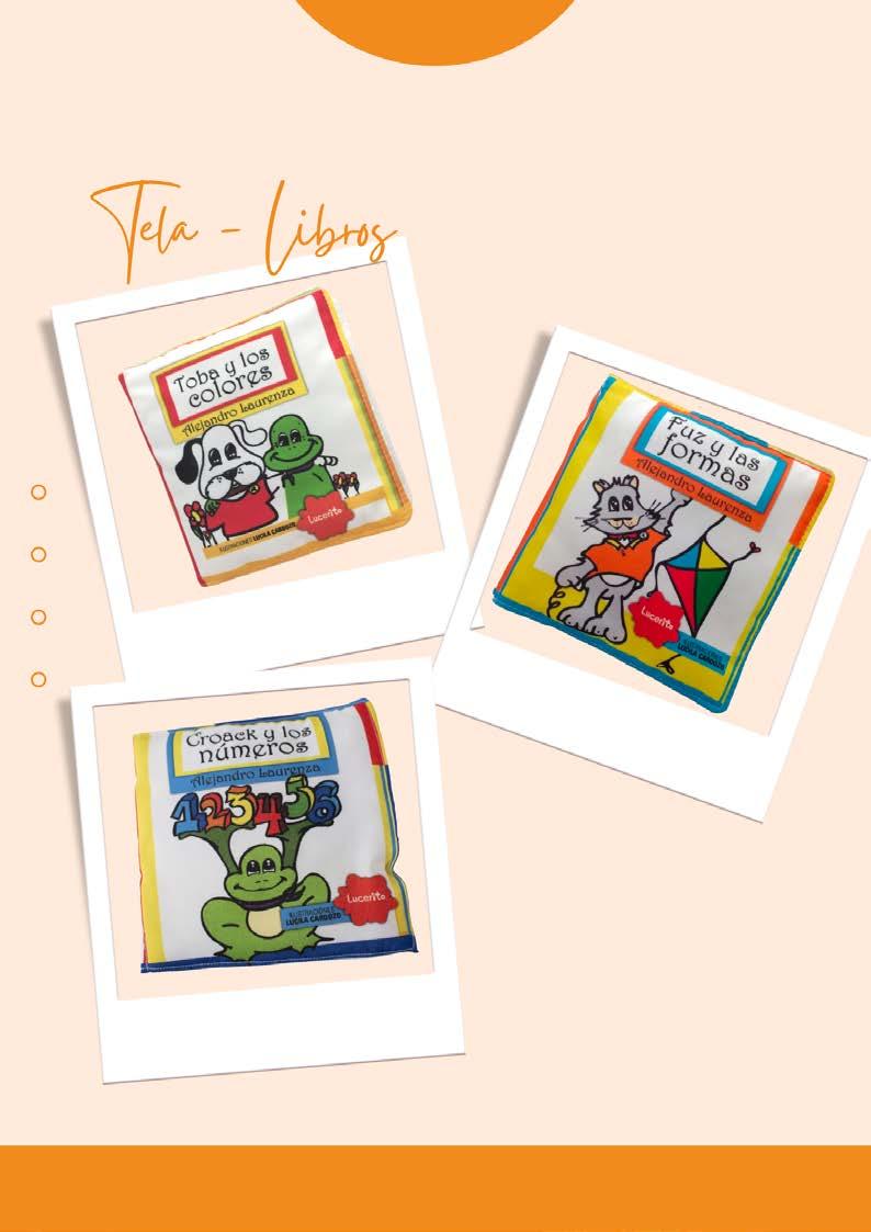 Tela-libros fabricados en tela microfibra con 4/6 hojas de 16cm. x 16cm. con versos y dibujos en colores, escrito en poesía corta.