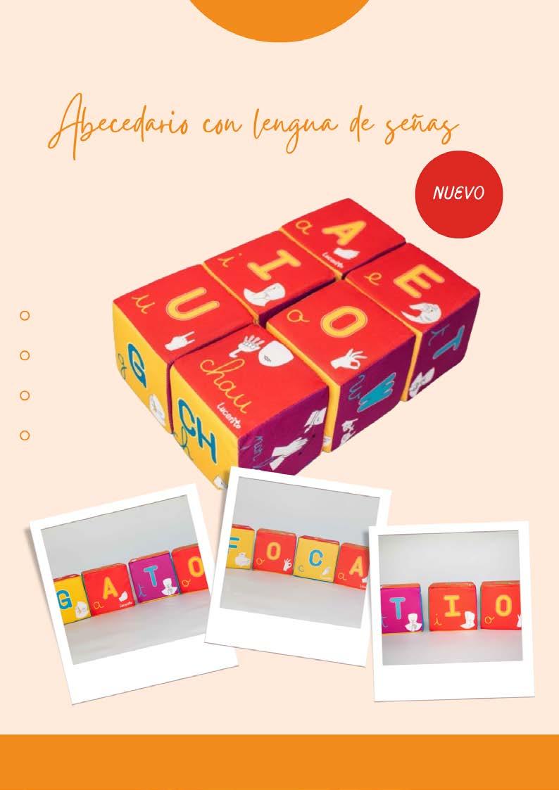 6 cubos de 10x10cm con el abecedario en letra imprenta mayuscula, minúscula cursiva y lengua de señas Fabricados en tela jersey de seda estampada