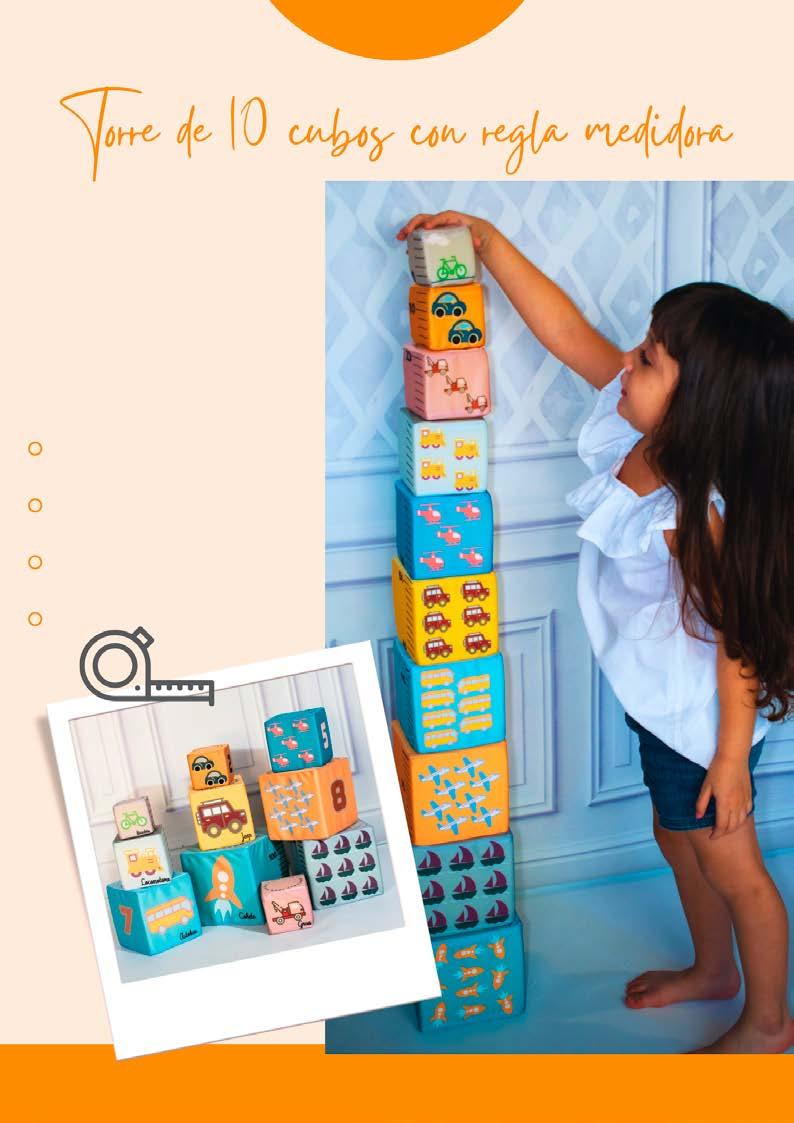Torre de 10 cubos blandos decrecientes de transportes, armada tiene una altura de 1.06mt, podes medir tu crecimiento mientras te divertis jugando.