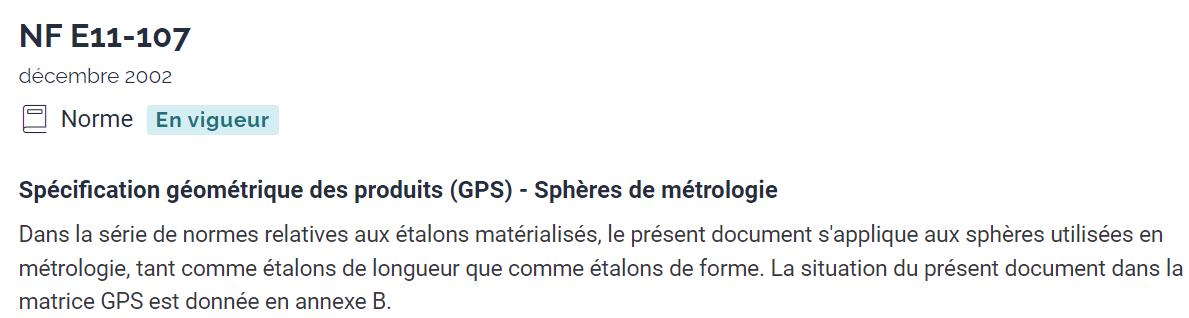 Commande de la norme NF E11-107 qui stipule que les caractéristiques à surveiller lors de l’étalonnage d’une sphère sont la rugosité, le diamètre global de la sphère et la circularité.