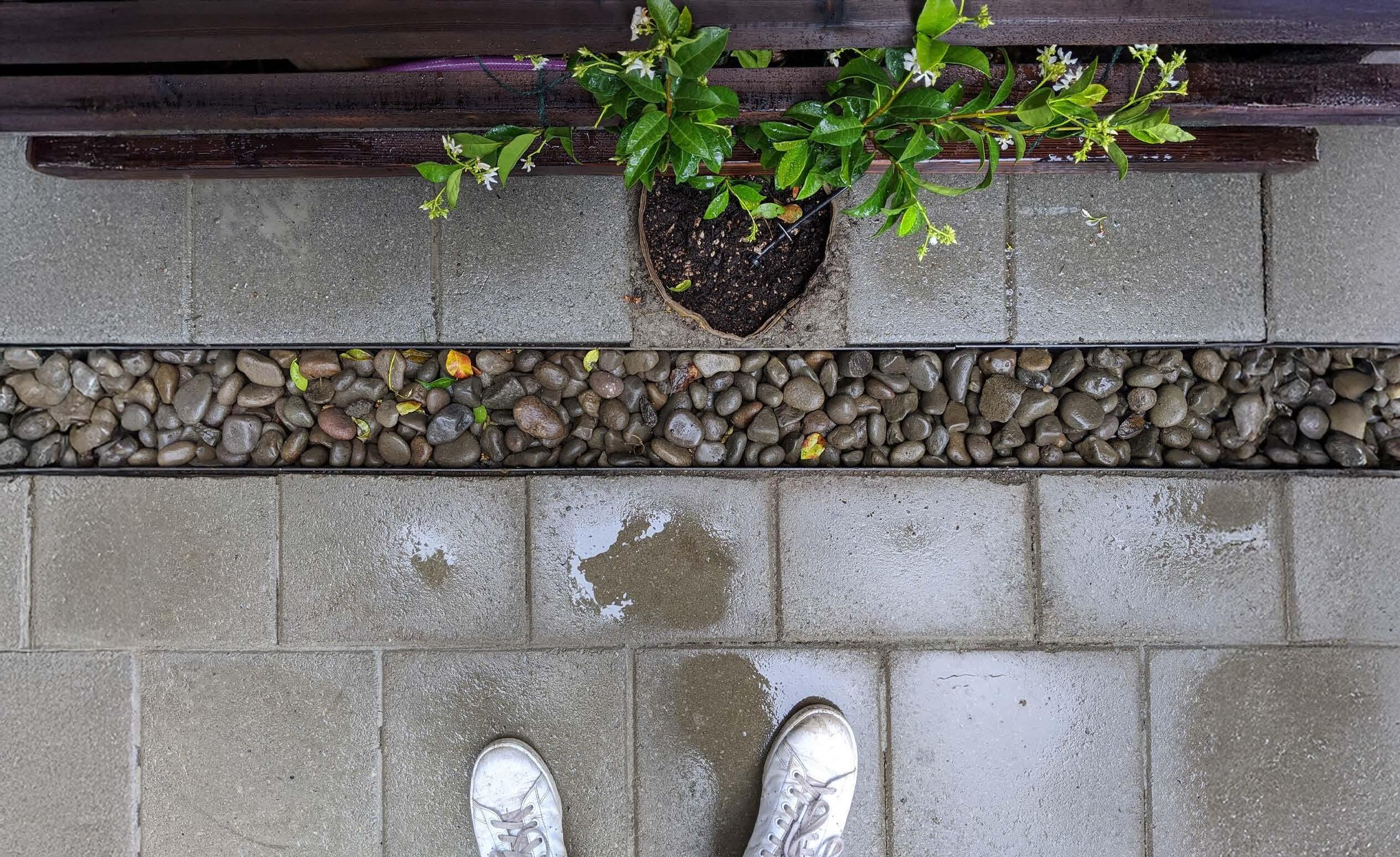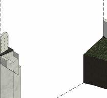 WAFFLE-SLAB RIB & CONCRETE PLANTER, MOISTURE GUIDED THROUGH WEEP HOLE ON BOTTOM. REBAR FOR ILLUSTRATION PURPOSES CONCRETE COLUMN, REBAR FOR ILLUSTRATION PURPOSES