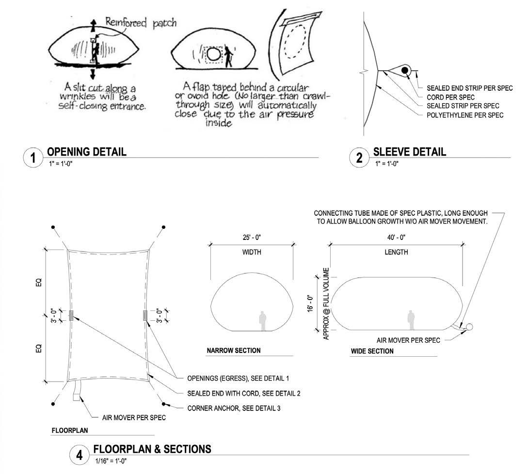 The design employs semi-transparent polyethylene that serves dual purposes - creating an immersive projection surface for light installations while maintaining consistent airflow through its fan-driven ventilation system. Perfect for temporary gatherings and overnight events across rural Los Angeles, the structure demonstrates how minimal materials and thoughtful engineering can create compelling spatial experiences.