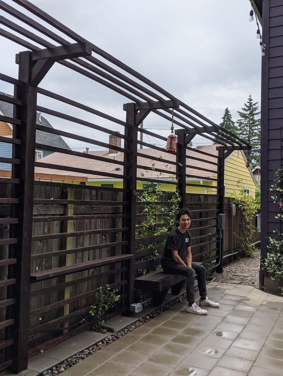This pergola showcases the Japanese wood preservation technique known as yakisugi (also called shou sugi ban), where cedar planks are carefully charred to create a naturally protective surface.