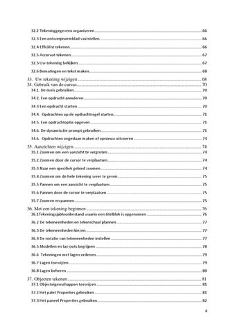 33. Uw tekening wijzigen ........................................................................................................ 68 34. Gebruik van de cursus ......................................................................................................... 70 34.1. De muis gebruiken ..................................................................................................................... 70 34.2. Een opdracht annuleren ............................................................................................................ 70 34.3 Een opdracht starten .................................................................................................................. 70 34.4. Opdrachten op de opdrachtregel starten................................................................................. 71 34.5. Een opdrachtoptie opgeven ...................................................................................................... 71 34.6. De dynamische prompt gebruiken ............................................................................................ 71 34.6. Opdrachten ongedaan maken of opnieuw uitvoeren .............................................................. 74