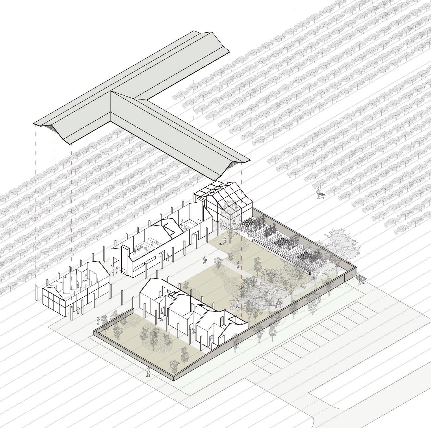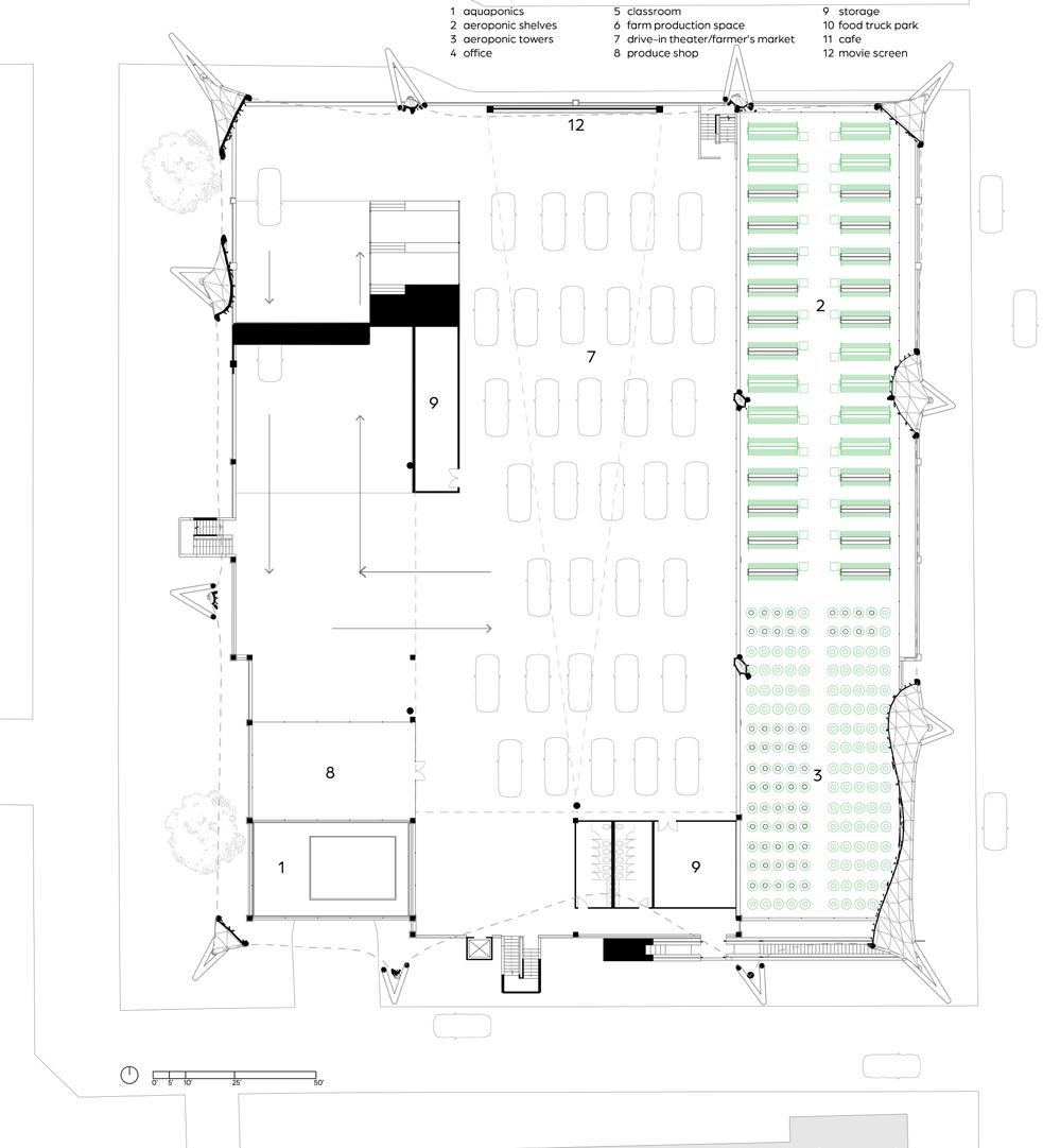 The Decatur Park + Grow invites pedestrian and vehicular visitors to enjoy a market serving produce from an onsite vertical farm while also functioning as a drive-in theater at night.