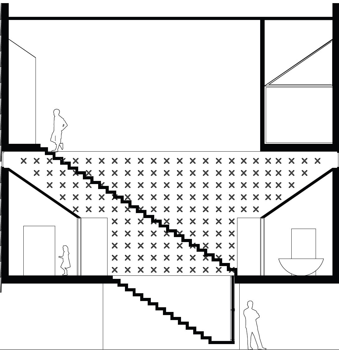 An elevating theatre/gallery and platform allow for multiple entrances and floor configurations. The vertical movement creates a space for formal performances as well as a black box space.