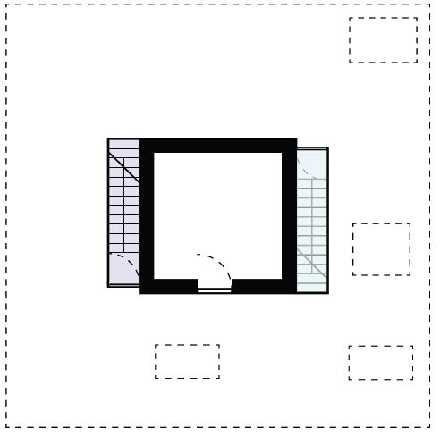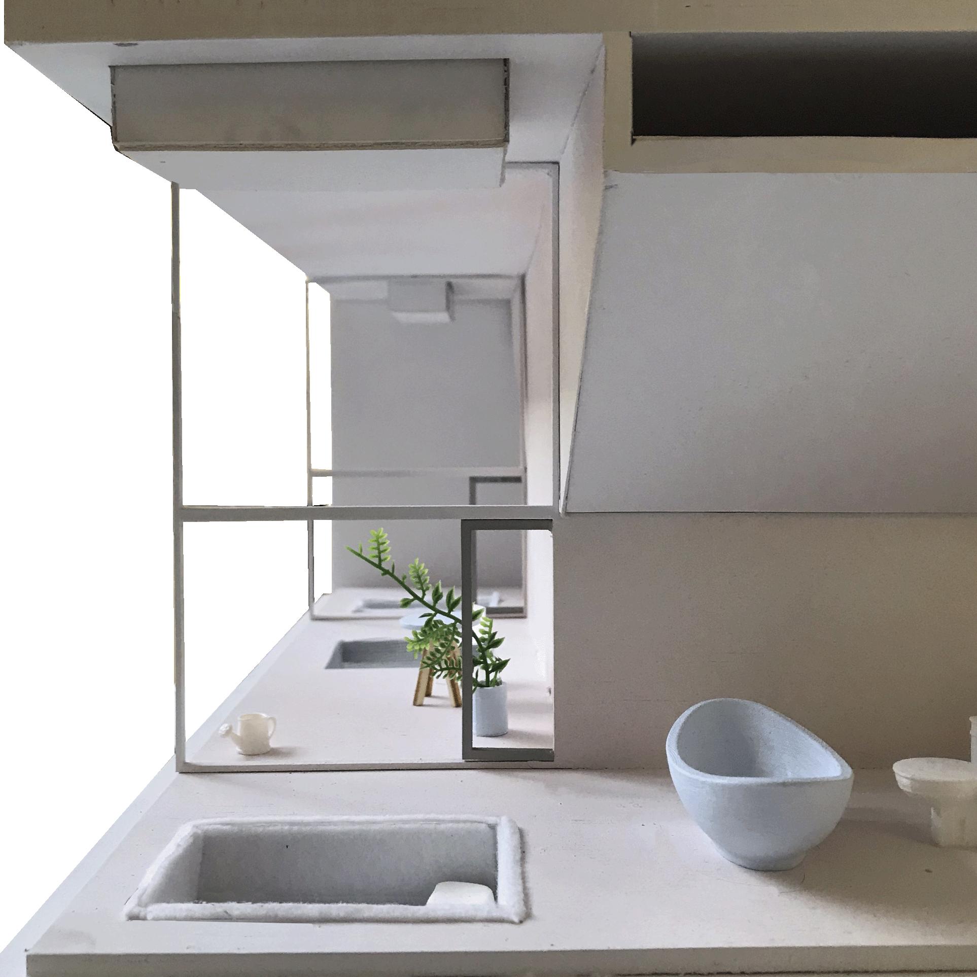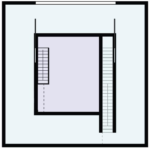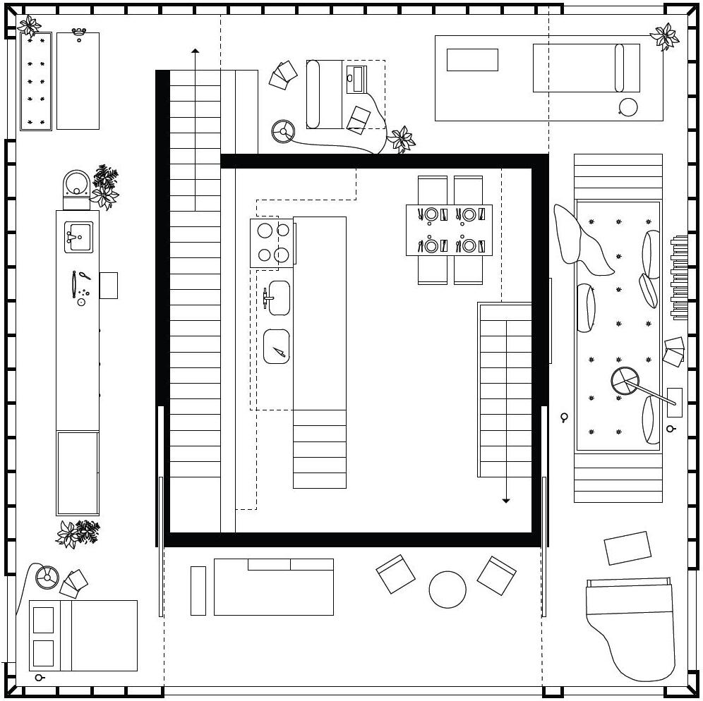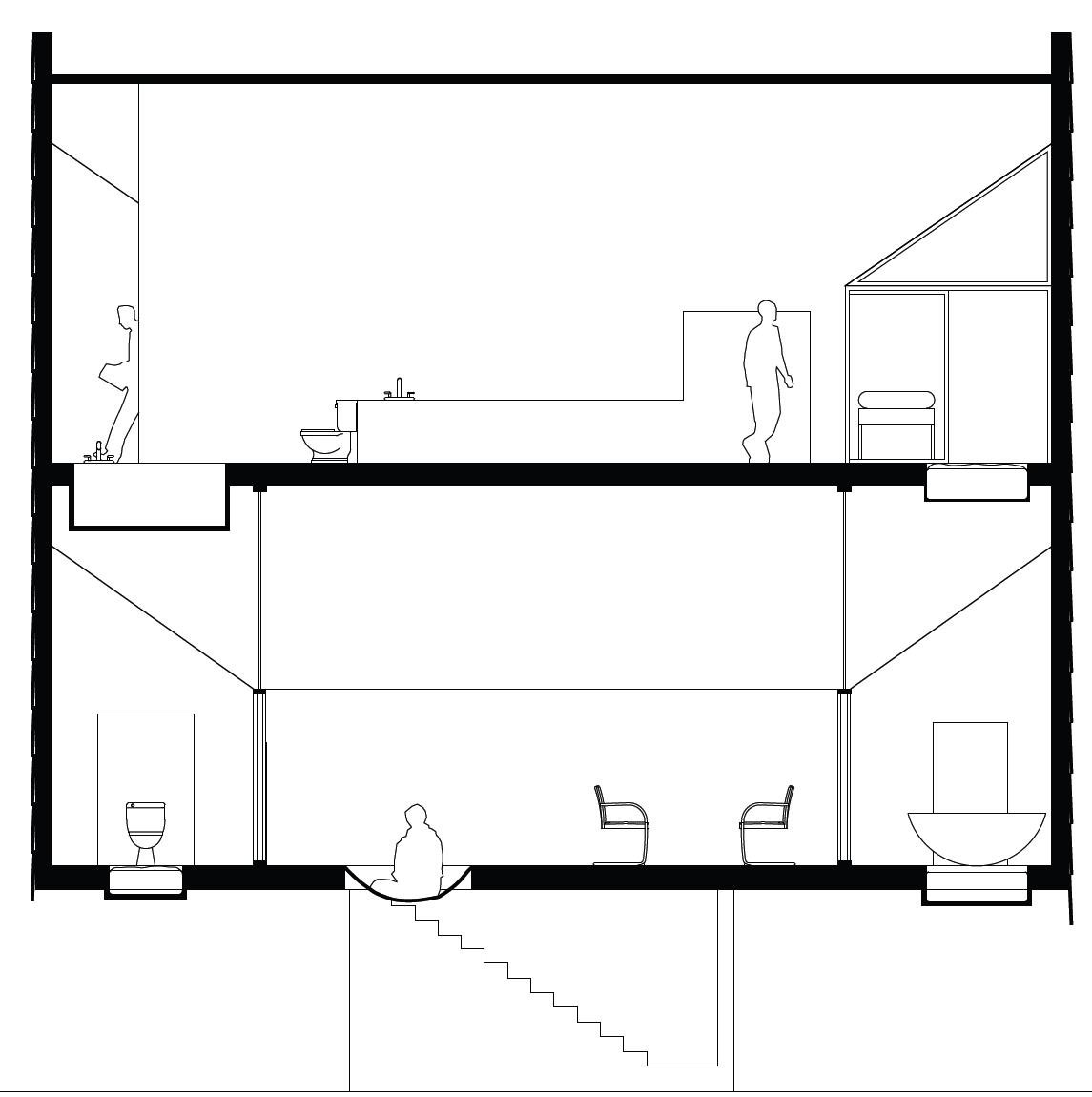 The two homes are intrinsically locked, affecting and defining each other but never really mixing. The effect is translated into a relationship between users of maximum autonomy and, at the same time, extreme interdependence. Each user can access one outer and one inner body in two different levels. The homes interrupt each other to get natural light in the inner body; the walls splay out and touch the exterior wall to form a window. This creates a slanted ceiling for the inhabitant in the ring. In both units, the kitchen space is placed in the center. On the top floor, the cooking area descends into the floor and protrudes into the cooking area of the other tenant. The extrusion is then mirrored on the ground of the bottom user to create a cooking and eating counter.