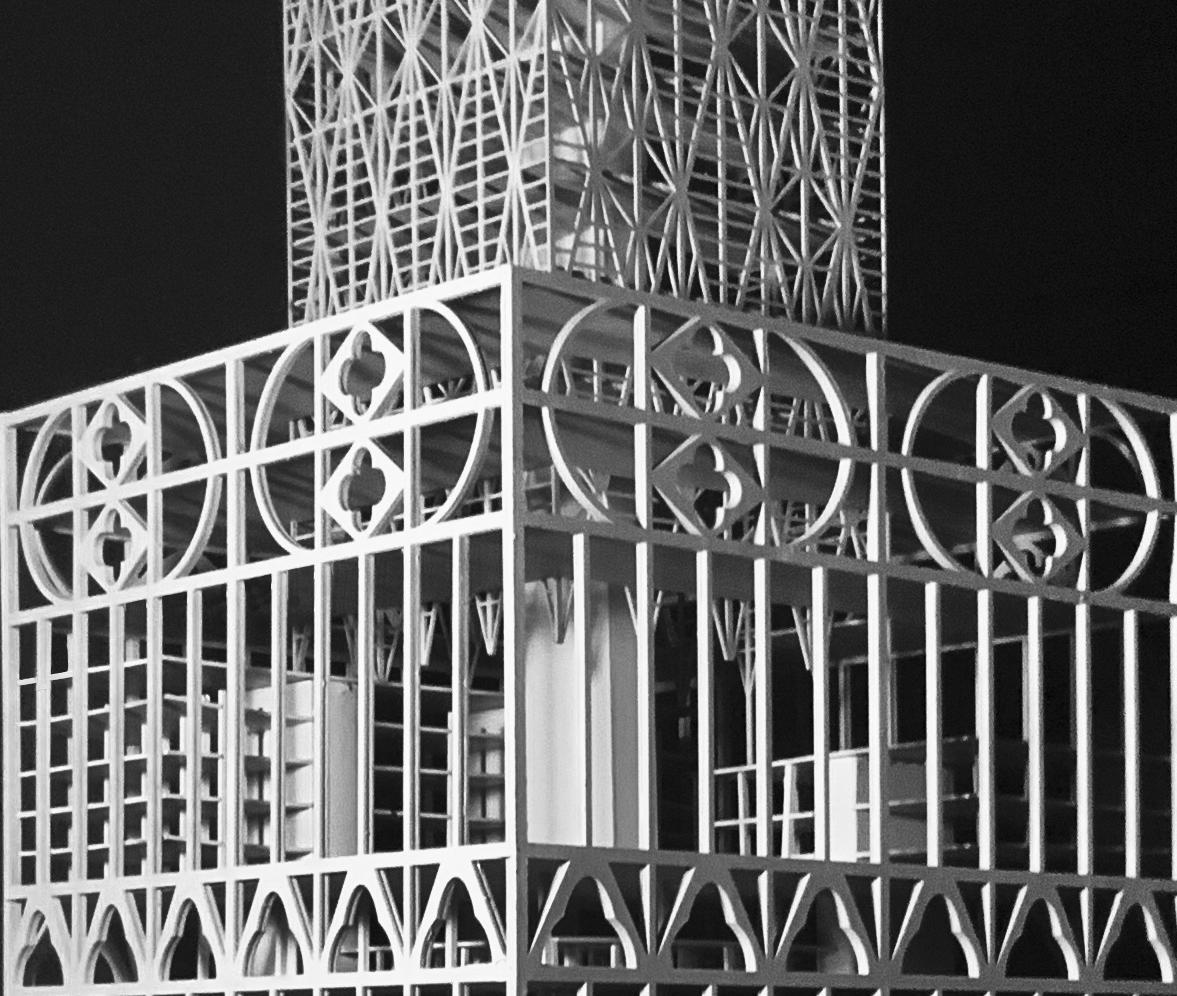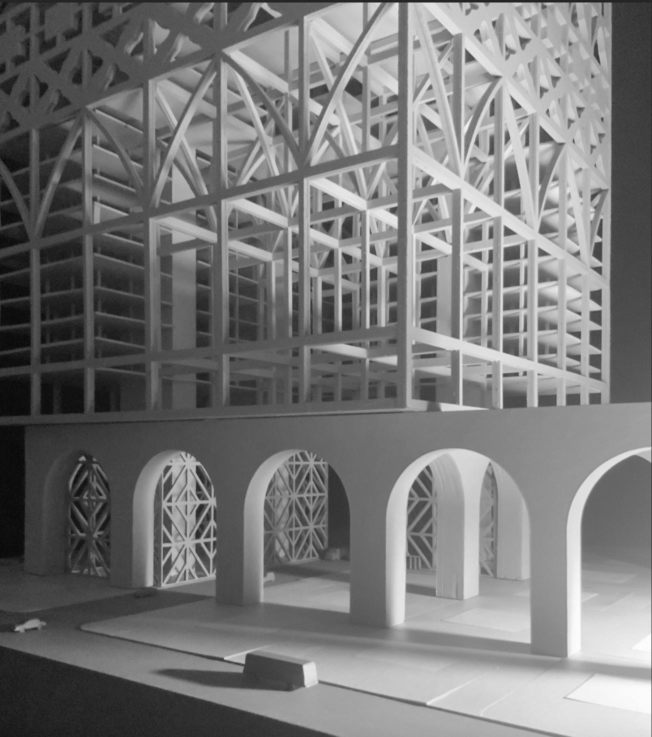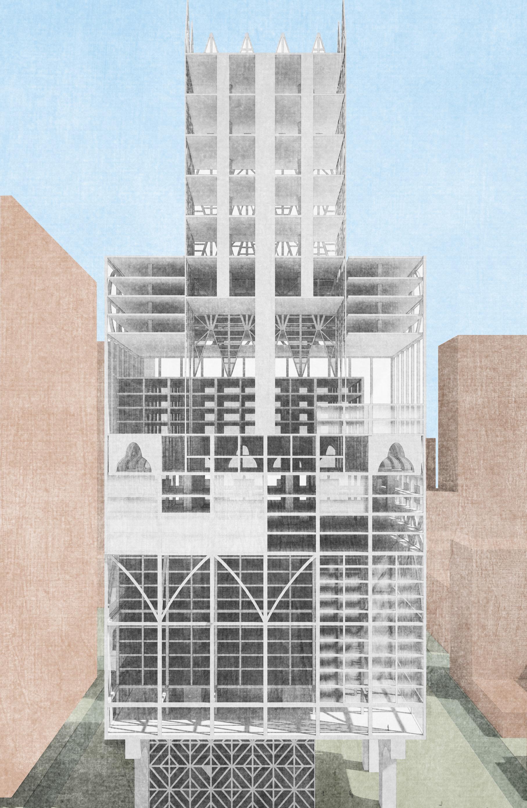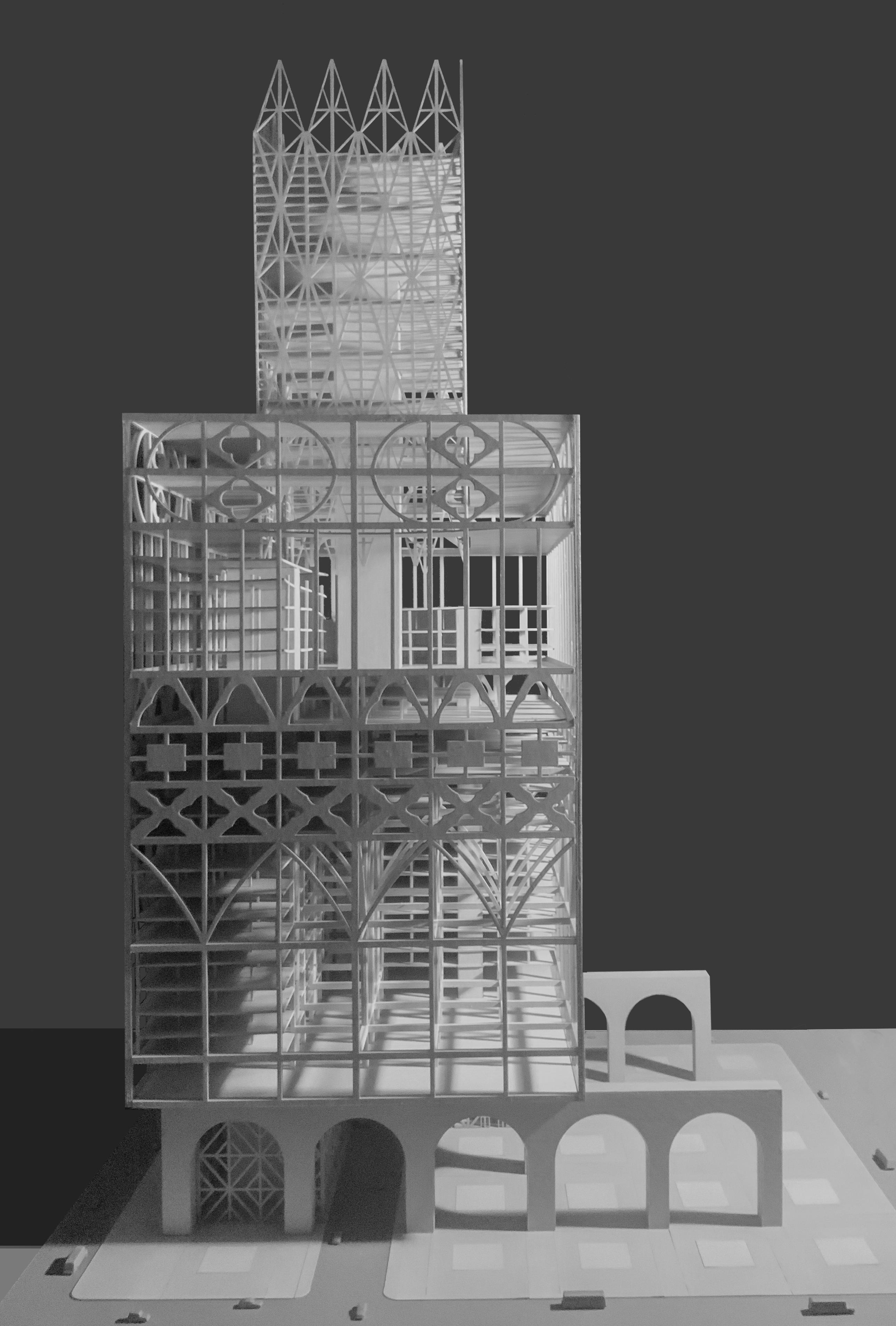 Using the domestic precedent of half-timber frames, this project scales up their form to create an urban tower. The semiotics of a domestic frame at an urban scale create a sublime sense of size, making the passersby feel like Lilliputians. The frame becomes large enough to house a smaller framing system and create an interior urbanism.