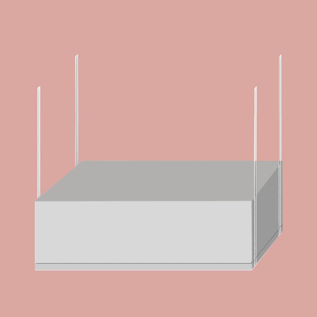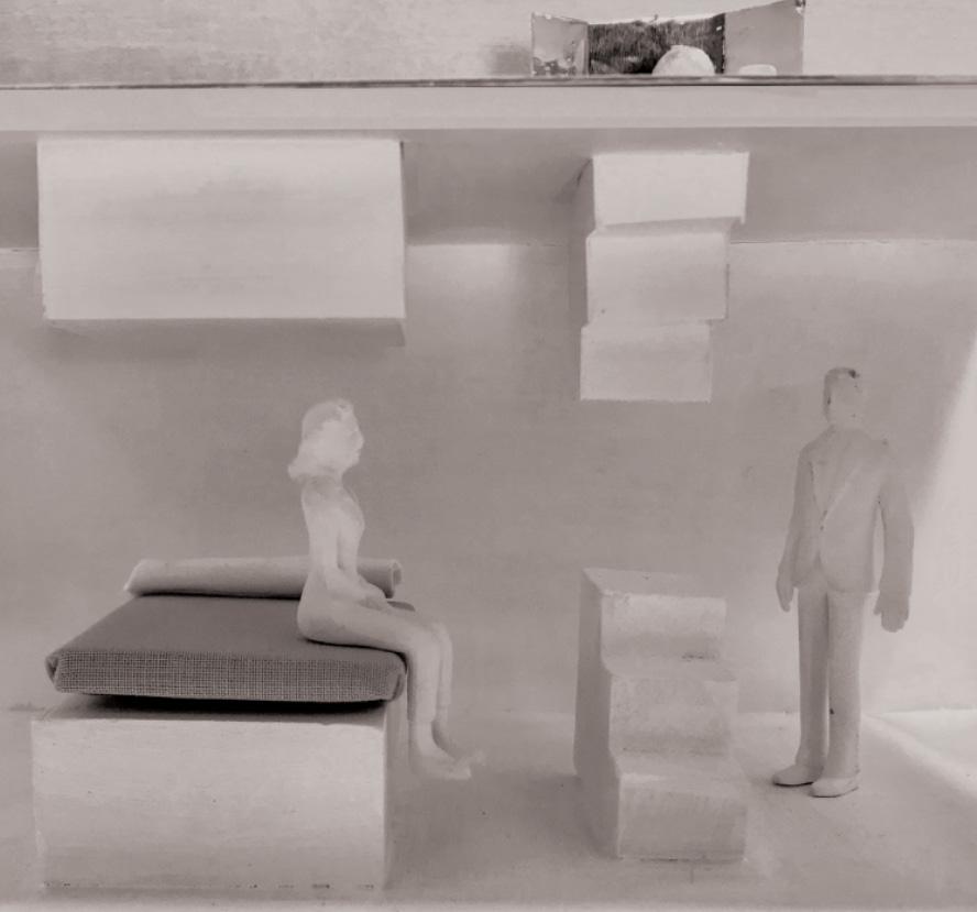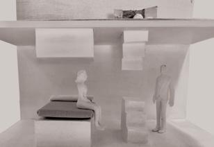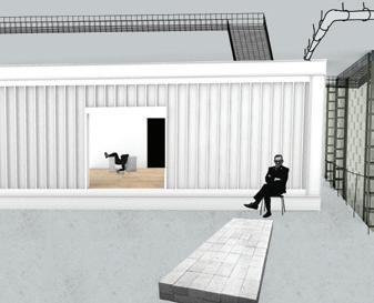 perpective: rotating white box gallery with black box in elevated theatre behind it.