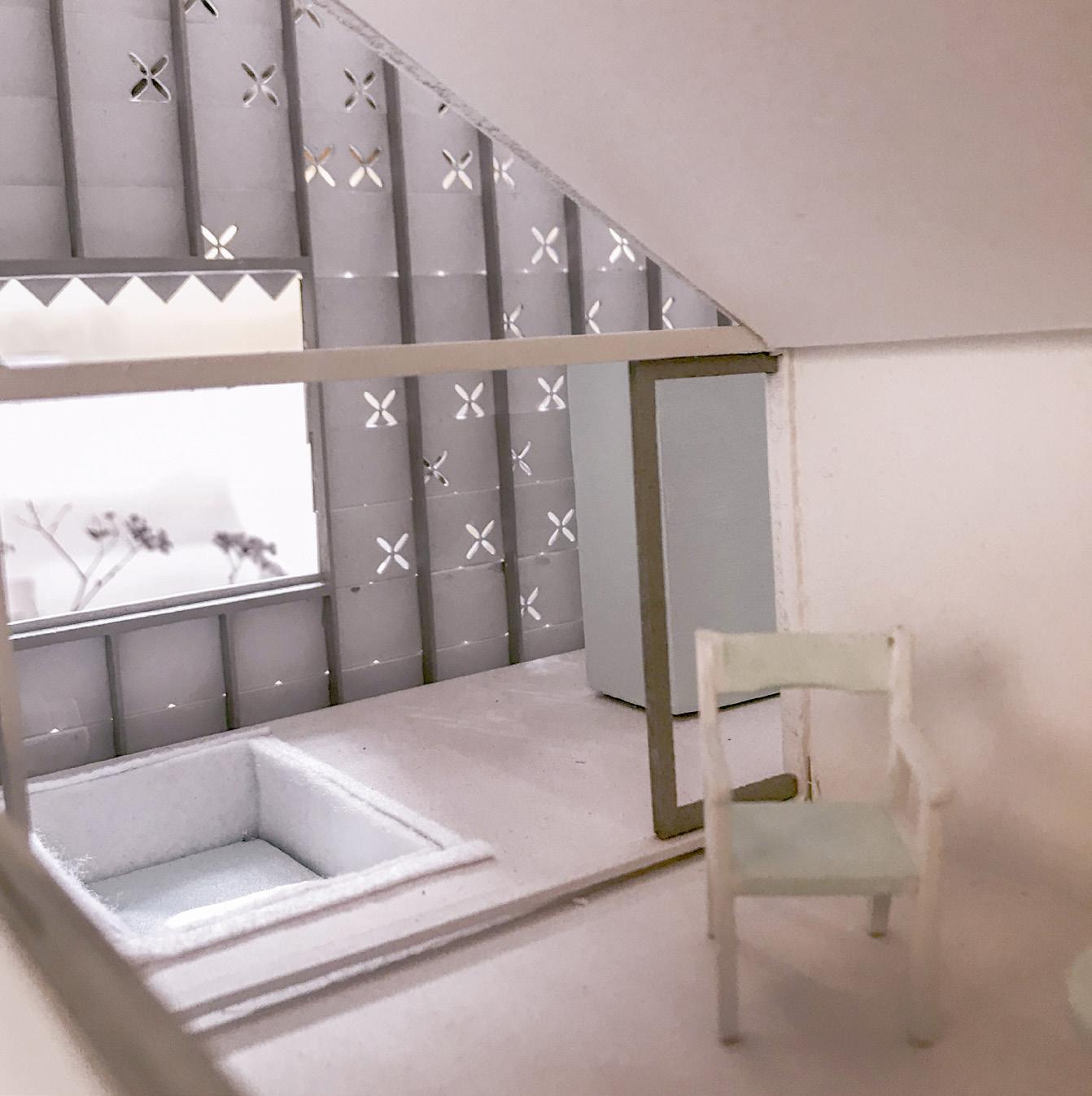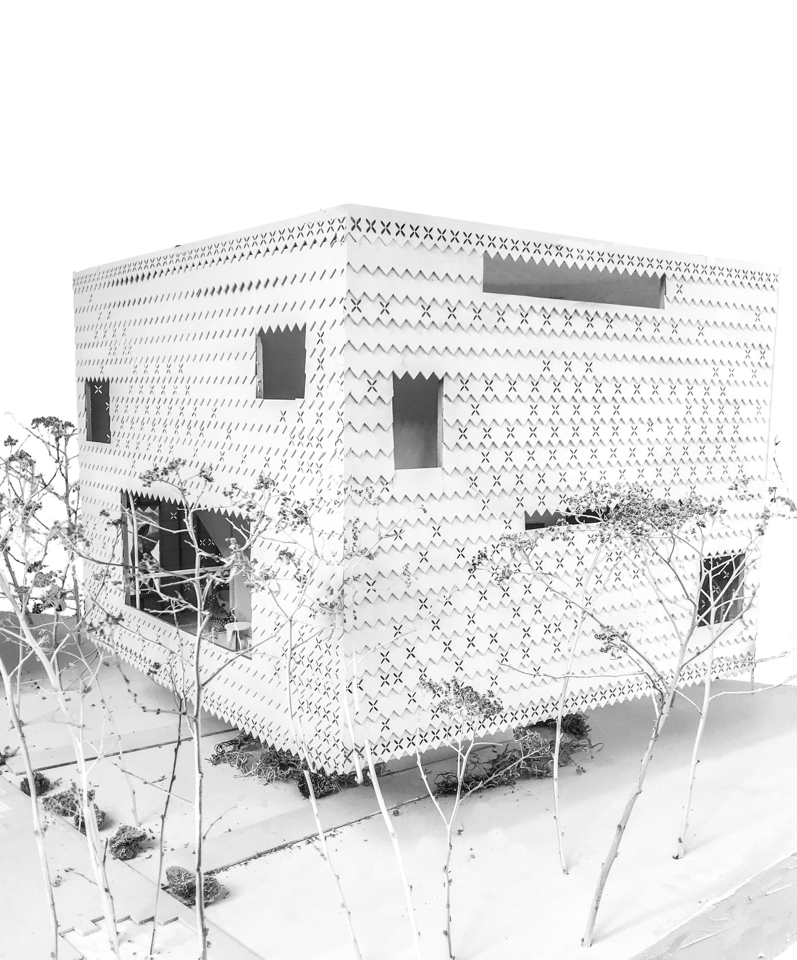 One of the units is inhabited by a family of four, while the other is a one-bedroom, almost penthouse apartment for a single person or a couple. The façade of the house is a series of cutout shingles overlain on a frame of steel and concrete, two elements that feel both urban and suburban. The shingles, as well as other elements in the house, contain a floral decal that ties the house to its natural setting and allows light into the house. The cutouts of the shingles also replicate the effect of seeing the trace of the other by only allowing a glimpse.