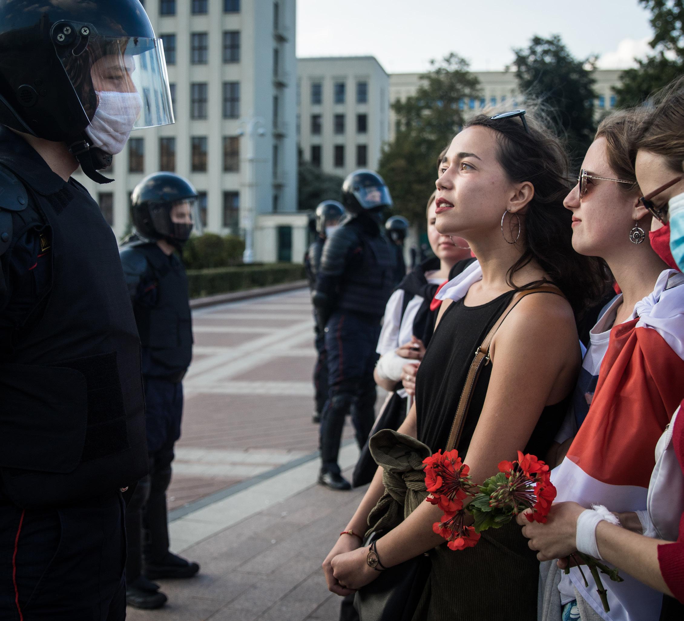 Another inspired protest technique used by Belarusian citizens to avoid violent repression from the police and military involved a particular role for woman in the protests. Due to gender ideologies inherent in the existing culture, police and military were less willing to use the same level of violence on women protesting as they would on male counterparts. Women used this differentiation to their advantage, and took to wearing white clothes and carrying flowers to symbolize a peaceful protest, and were thus able to successfully wage protests against the falsified election results with minimal arrests and violence. While women-led events happened throughout months of protests in response to Lukashenko’s regime, the events of August 29, 2020 were chosen and mapped, an event almost entirely with women, demonstrating the effectiveness of the strategy.