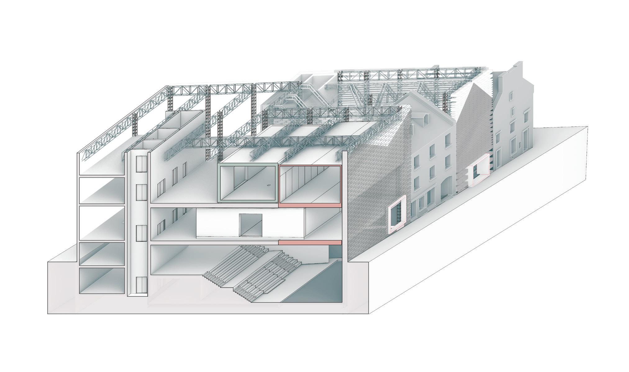 To allow for the shifting technological and spatial needs, this project exposes the duality of the front-of-house and back-of-house spaces needed to create the technological illusions of contemporary art. Much of the new construction exposes the mechanisms of the building, not just to reveal the “man behind the curtain” but to create an easily hackable space that can adapt to the needs of each installation. Moving through the building, the user encounters a range of experiences, depending on her path, which includes the four-hundred-year-old brick walls, exposed structural and utility components, white boxes, and black boxes.
