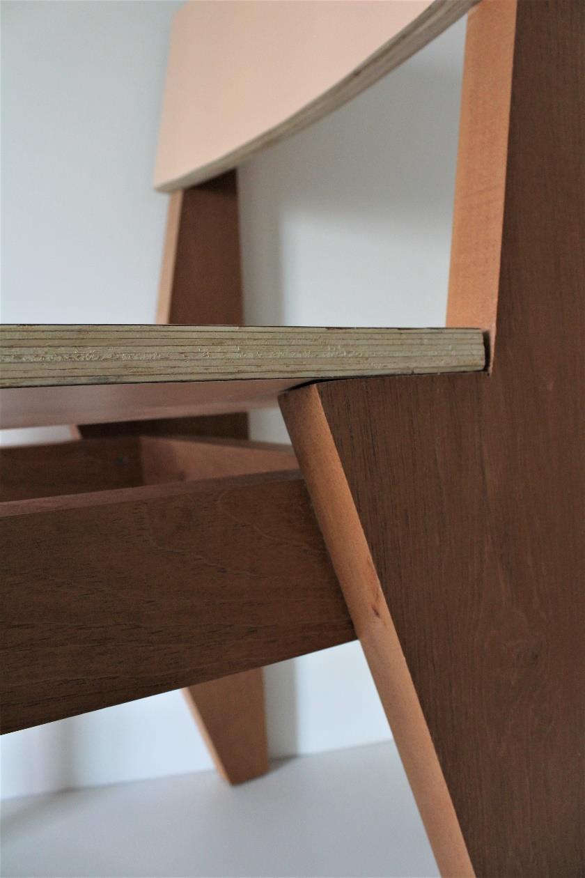 O assento e o encosto foram produzidos com chapas de compensado flexível coladas entre si e curvadas, para levar mais conforto ao usuário. Para curvá-las foi produzido um gabarito em MDF com a curvatura desejada. Para dar acabamento às duas peças foi aplicado um laminado rosa claro, contrastando com a estrutura