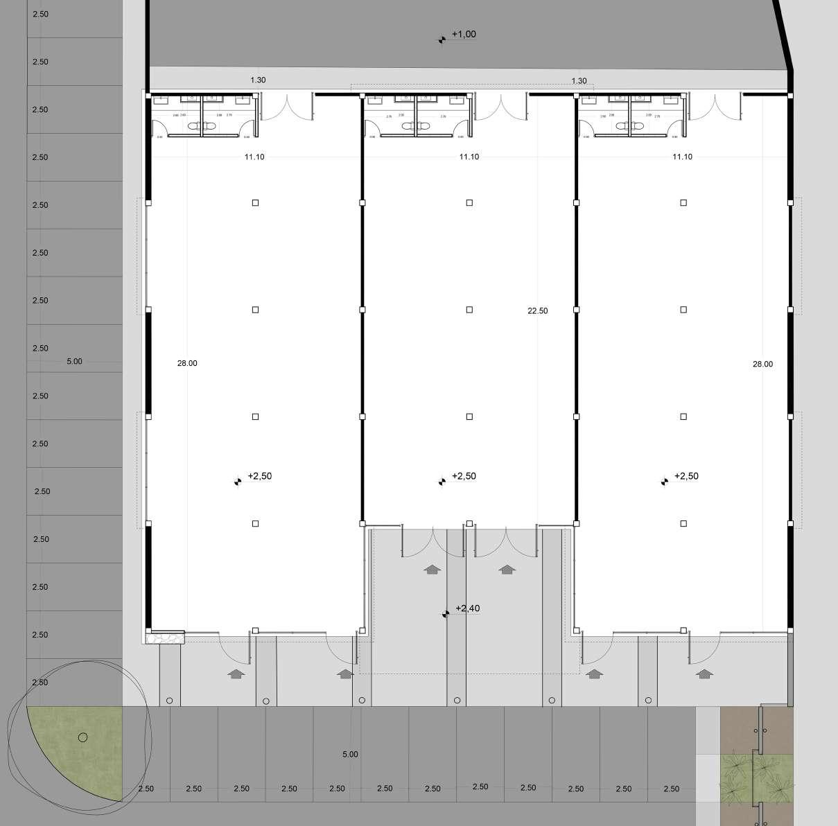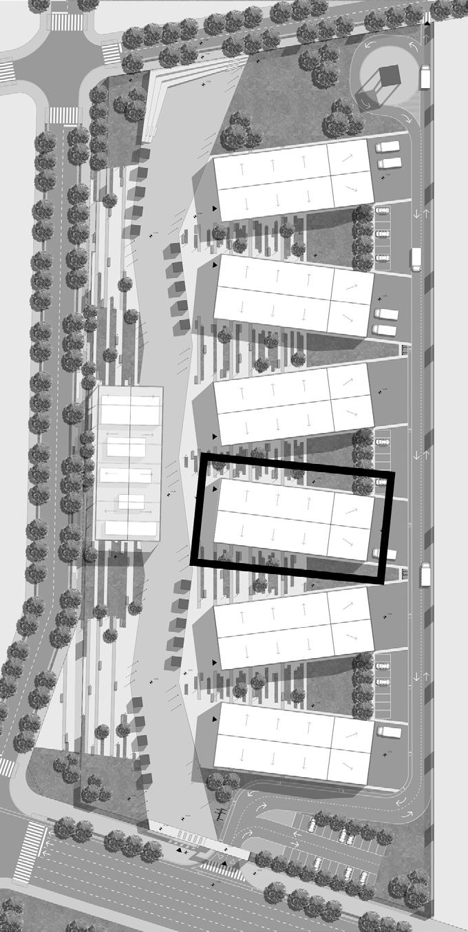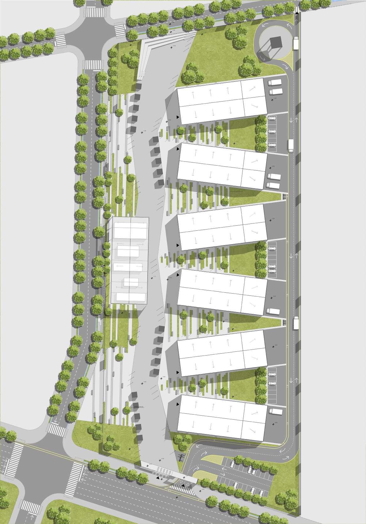 The site plan reveals how the arrangement of the industrial warehouses was designed to create a sense of movement, adding dynamism to the pedestrian path and integrating green spaces for both visitors and employees to enjoy. The pedestrian path runs to the west, culminating in a small seating area beside the coworking warehouse, while to the east, the industrial warehouses are located with dedicated truck circulation and employee parking. To the south, the entrance to the complex is situated along the street that intersects with the newly extended tramline.