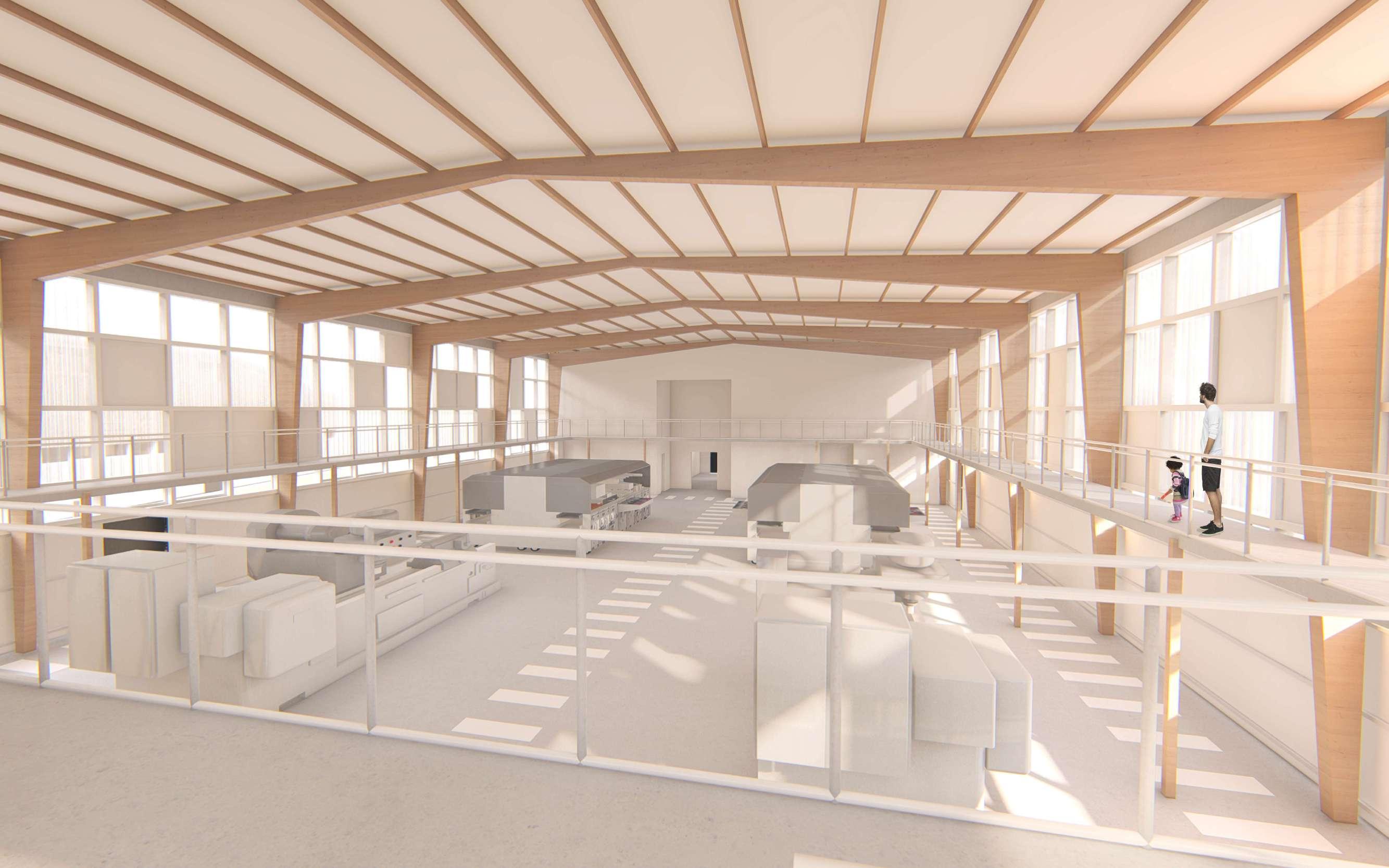 Walkway with views to the factory for guided tours, offices and laboratory