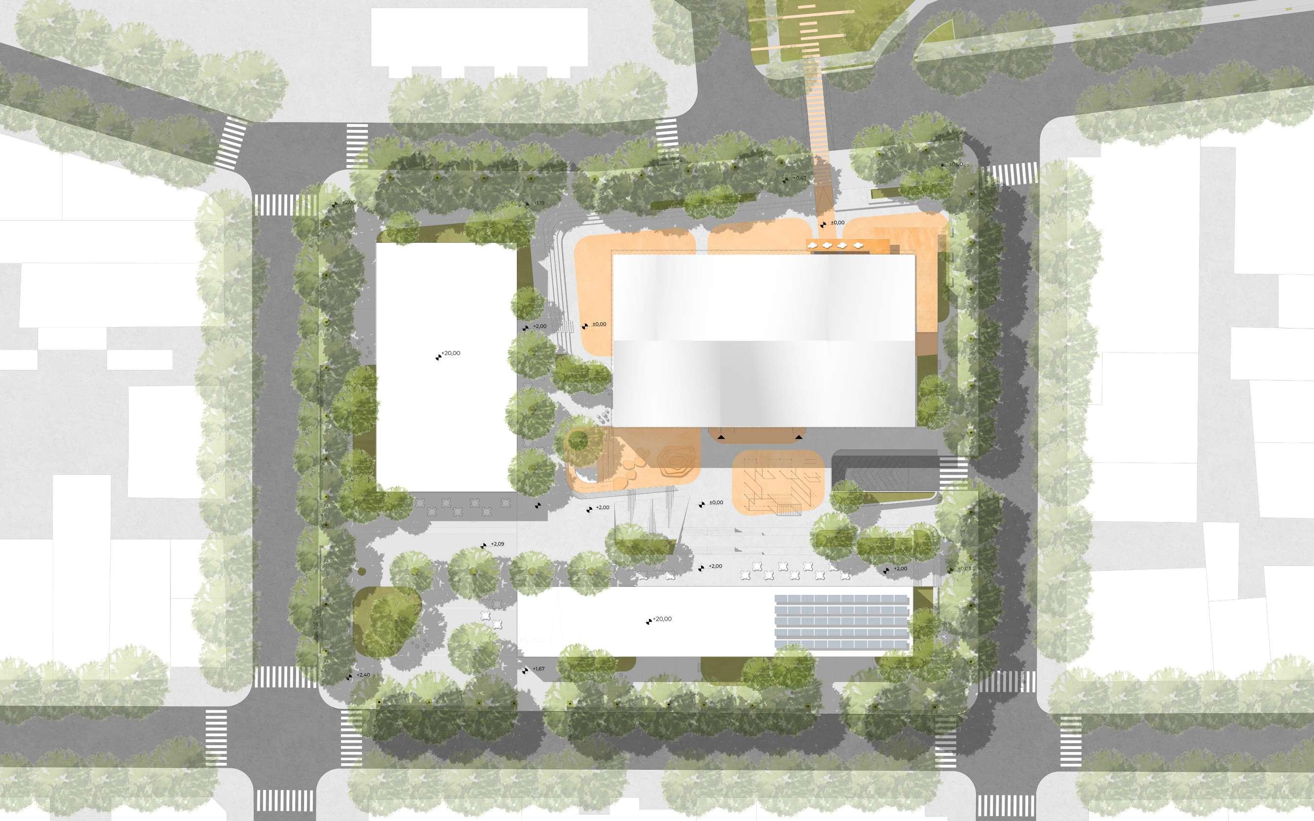 The site of the building is located in a mostly low-density area, but the municipal code encourages high-density development, as seen in some surrounding buildings. As a result, a portion of the site was allocated to residential buildings with commercial ground floors, which will also bring life to the projected public space.