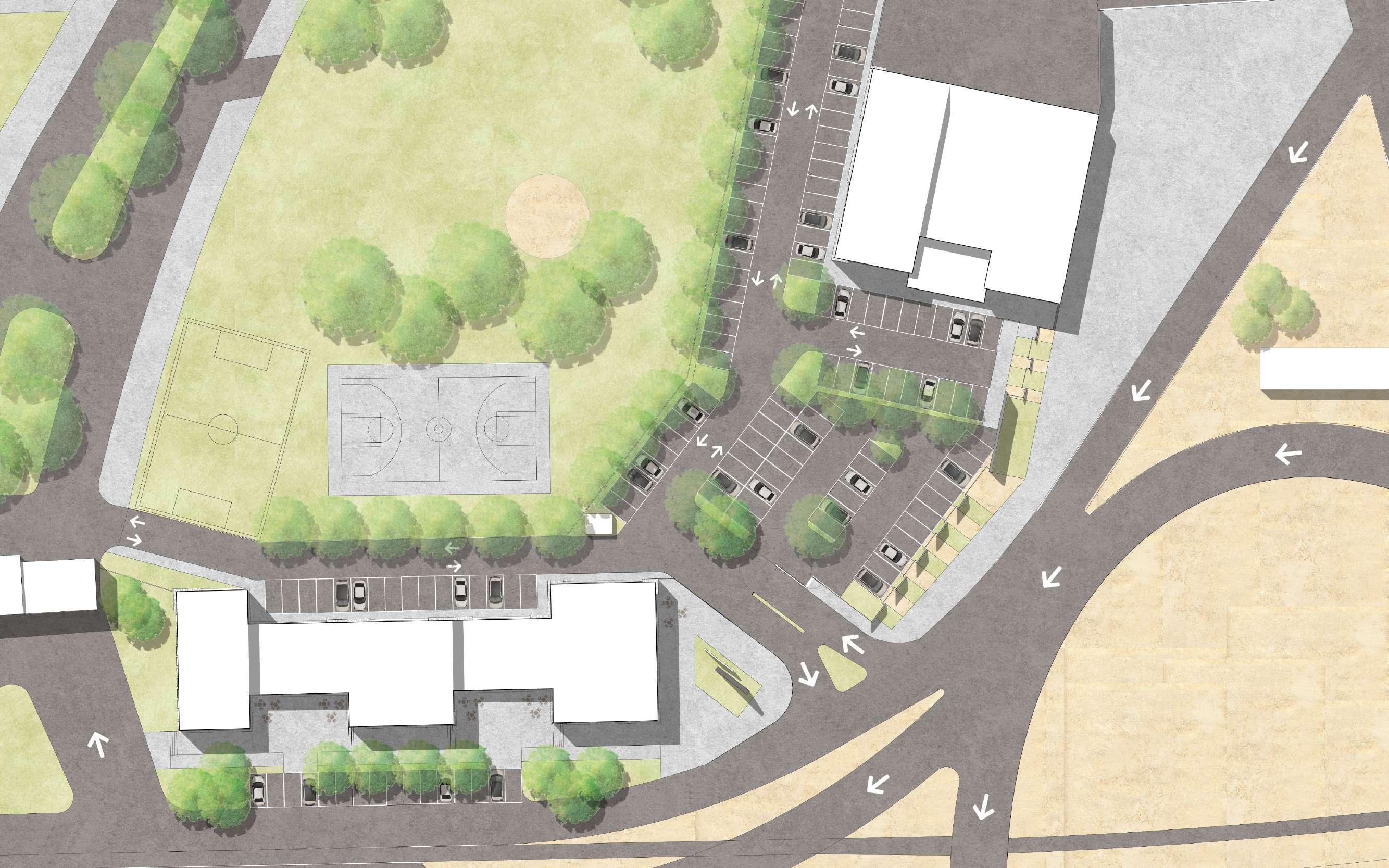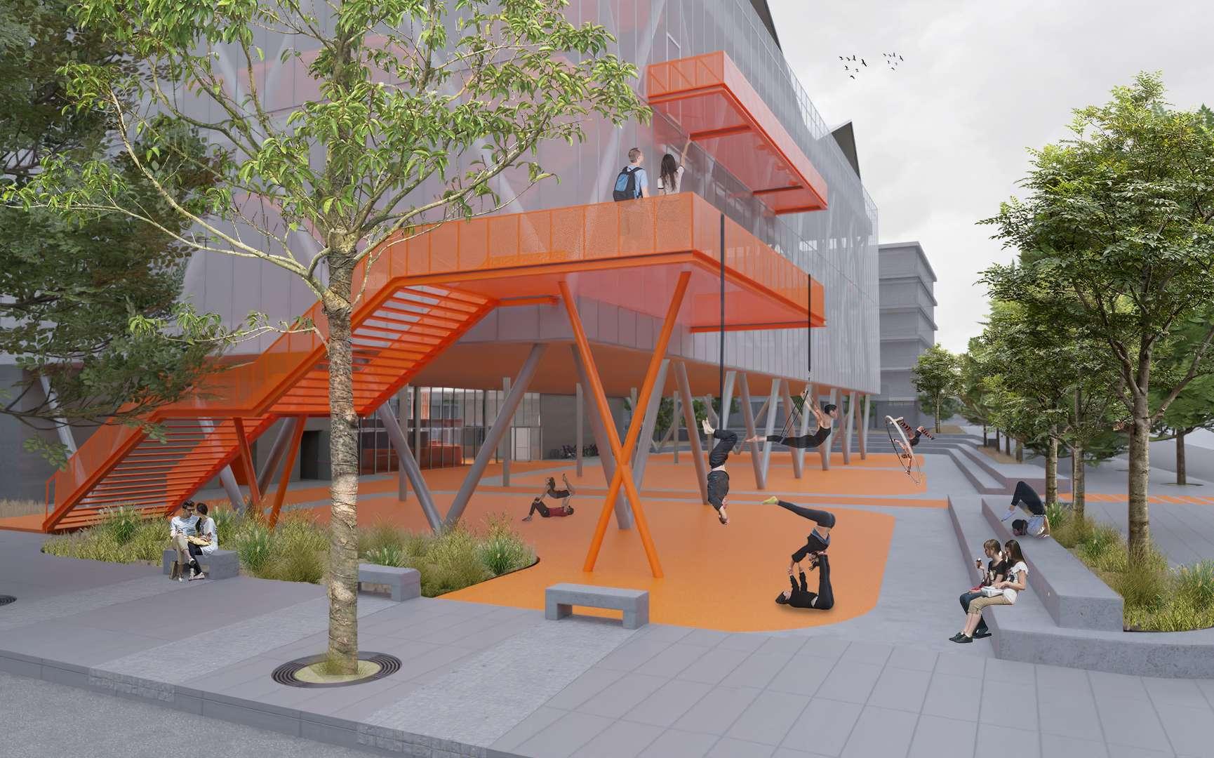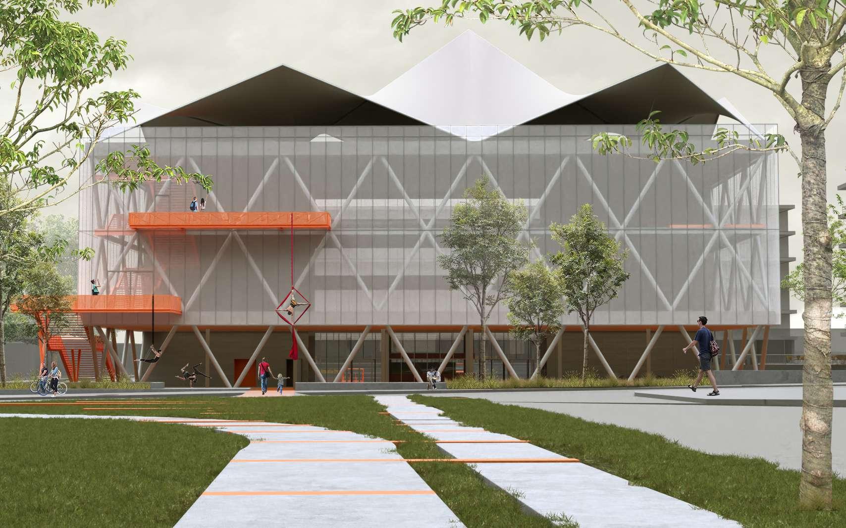 Exterior render View from the park towards the main facade of the Circus School.