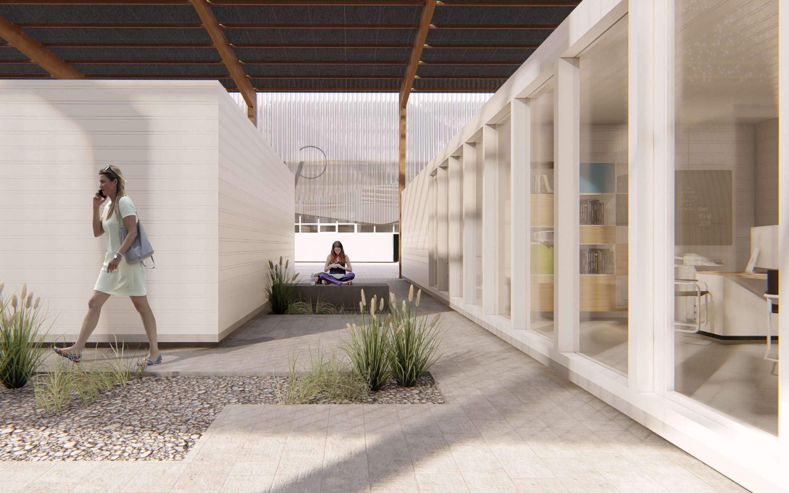 Exterior render Pedestrian path with view to the coworking area and one of the industrial warehouses