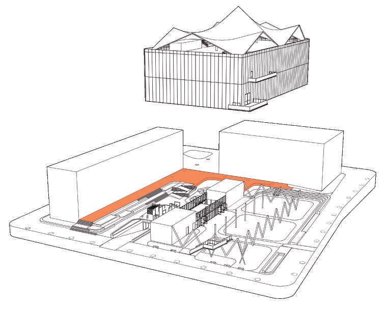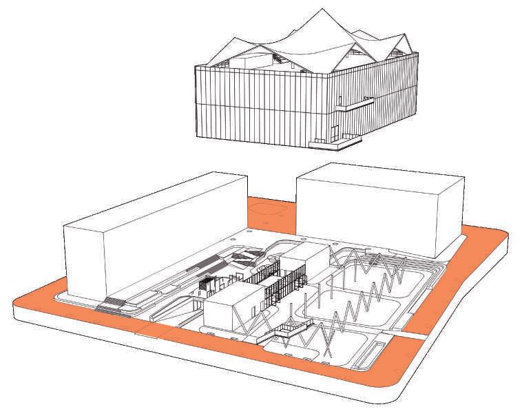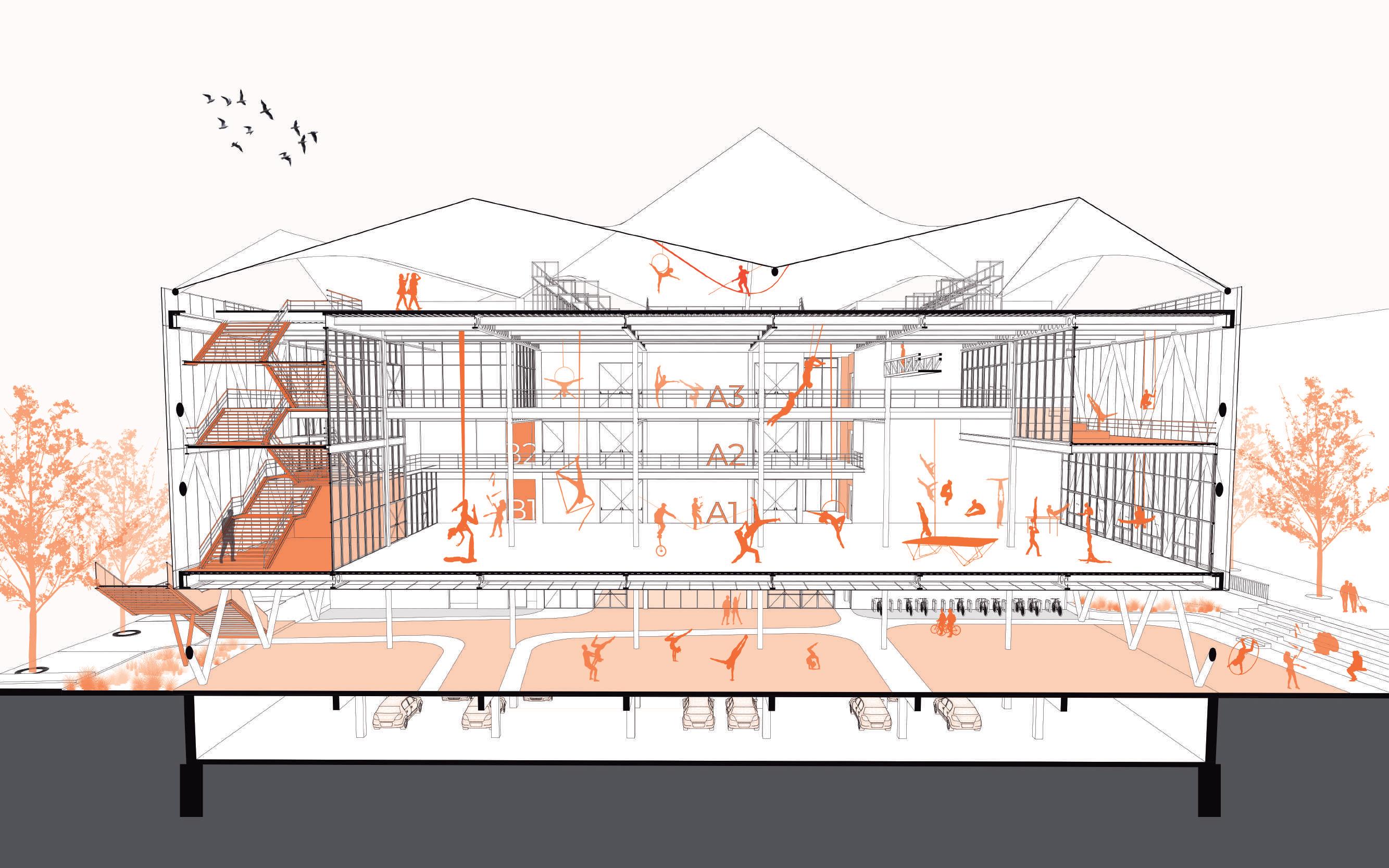 The idea behind this project is to provide a space for all those who practice street circus arts in the city, with all the spatial requirements necessary for the various activities. The goal is to create a space that preserves the spirit of performing arts in public spaces, while also providing a venue to showcase these arts. The building consists of a public space equipped for activities and small performances, open to all, a school space for classes and workshops, and finally, a flexible space for circus exhibition.