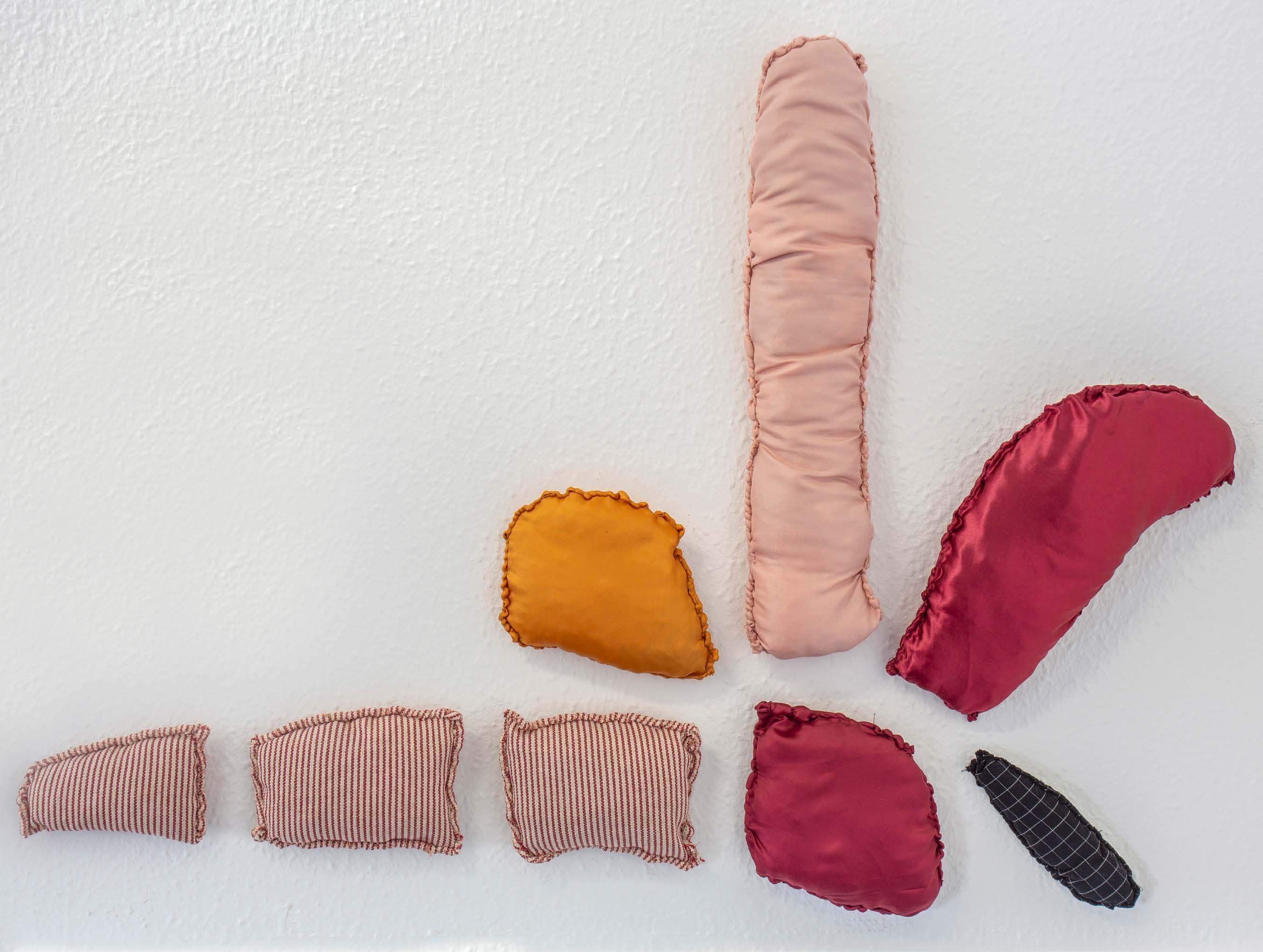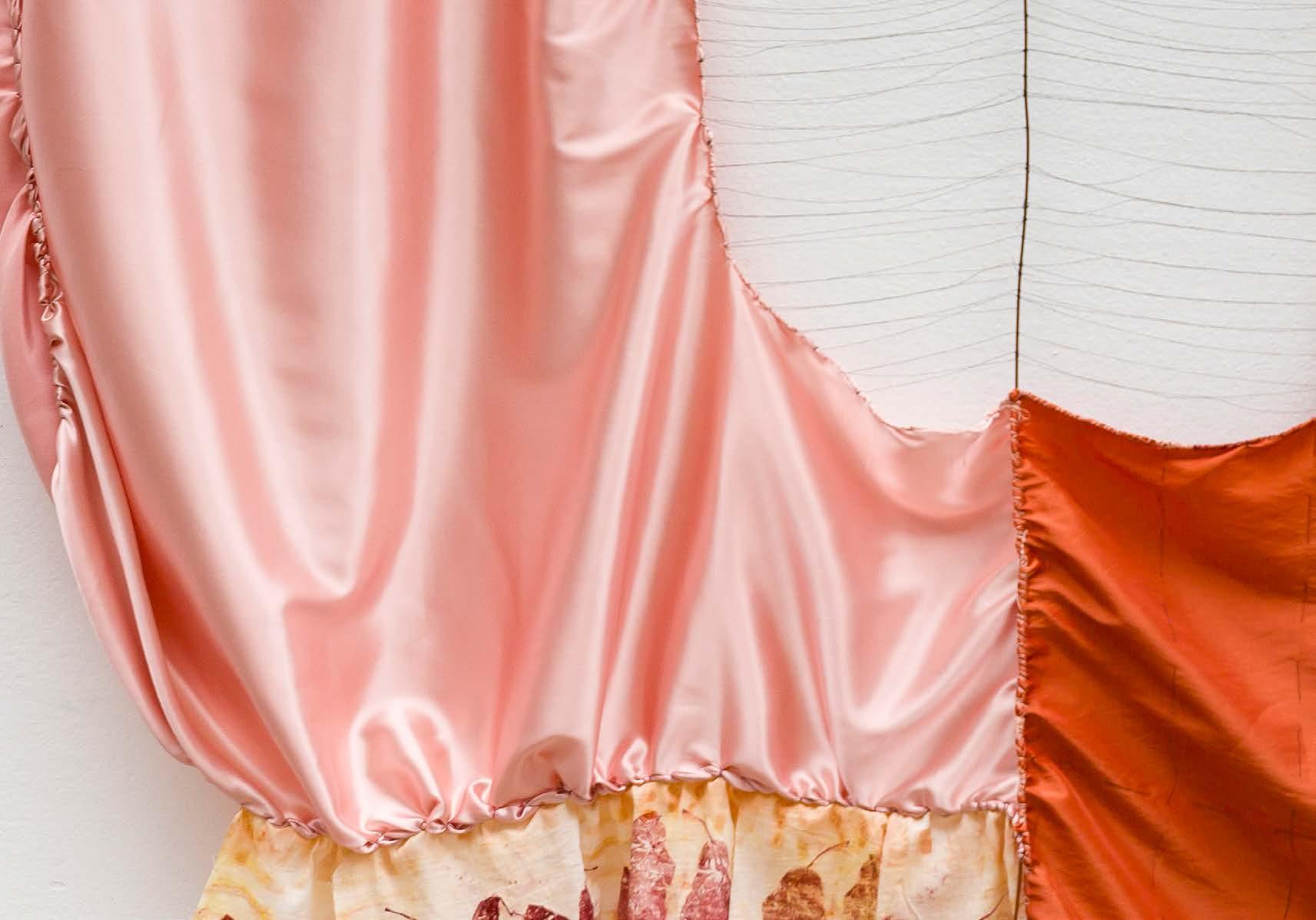 Não será por acaso que Juliana é formada em Arquitetura, nem que no seu trabalho se encontrem múltiplas conexões entre o corpo e a casa, essa “bolsa maior”. Porém o interesse pela arquitetura pode não ter sido nunca o desejo da construção de uma materialidade como tal, mas o início dessa busca pelo que constitui, precisamente, um abrigo. Esta abordagem torna-se especialmente clara nos painéis respiro aliviada (2024) e todo dia uma insônia (2023). Nestas paisagens-corpo o cetim, um tecido leve e brilhante, é a base para intervenções sutis que falam de partes de experiências de um corpo-arquivo. Podemos olhar para estas paisagens como se de uma pintura se tratasse, remetendo-nos a lugares que alguma vez habitamos – geográficos ou emocionais. Mas podemos também reconhecer nelas partes de corpo – caixa torácica ou pulmões, barriga, ventre ou saco gestacional, espinha dorsal, pele, rugas e cicatrizes. É assim, que no cruzamento de técnicas de tecelagem, costura, bordado e crochê, as obras de Juliana, que ora se assemelham a pinturas, ora a esculturas, evidenciam a relação estreita que existe entre os espaços físicos e o nosso sentir, assim como a nossa necessidade de nos reconstruirmos em função deles.