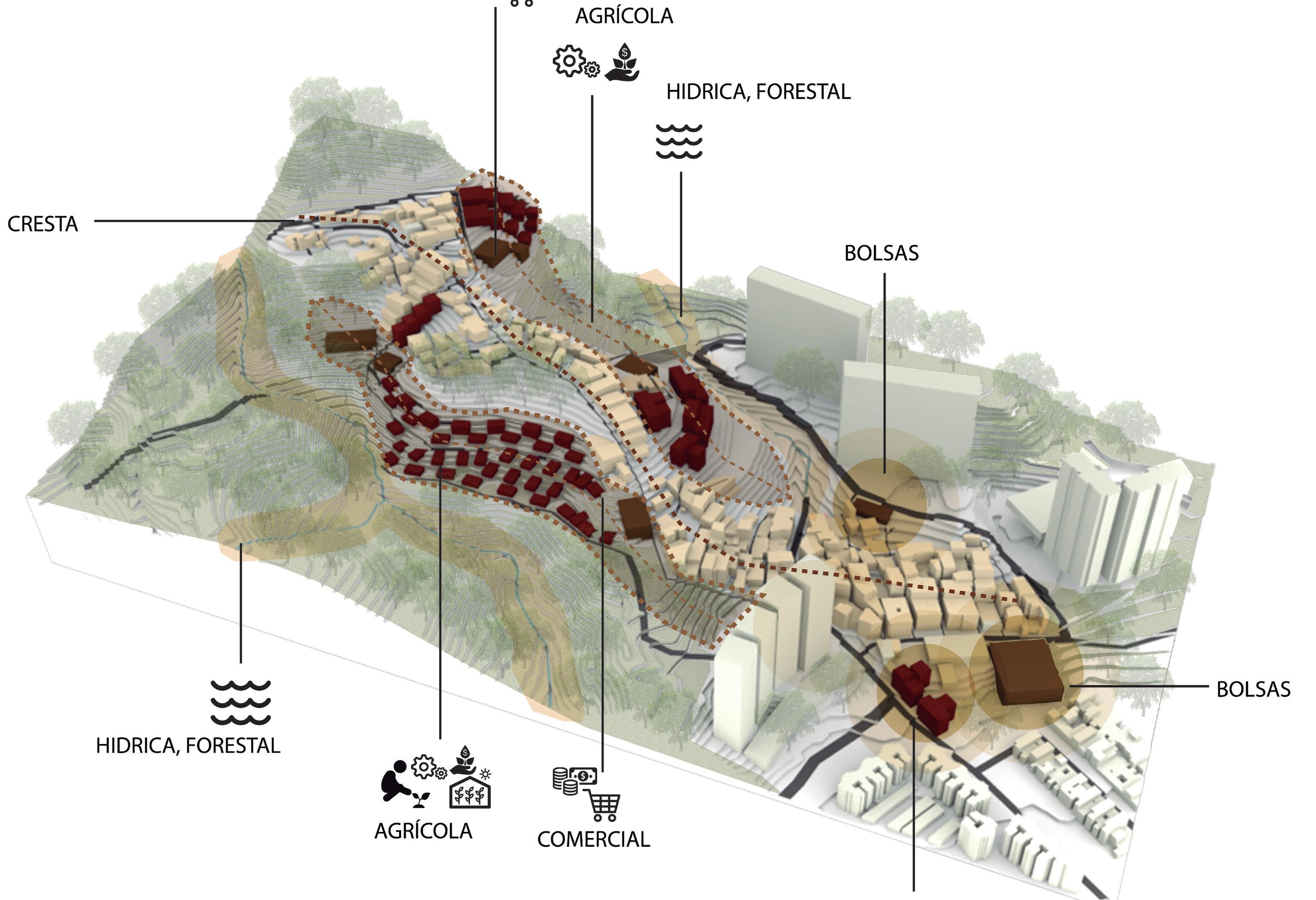 Se proyectaron redes de senderos peatonales, espacio público, dos equipamientos (Reciclateca y Bioteca) y 3 tipologías de vivienda (rurbana, productiva y la progresiva)