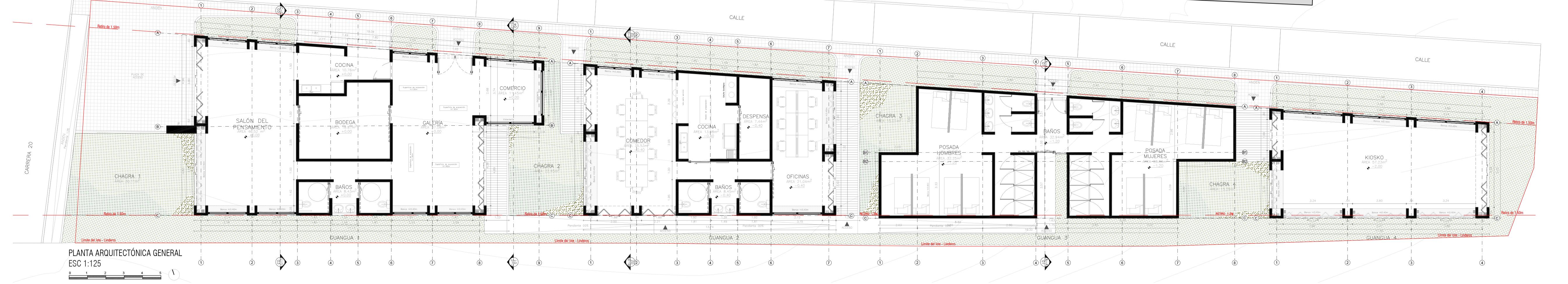 Como premisa espacial del proyecto, se parte de albergar las Chagras (formas de cultivos indígenas) y los 4 módulos que disponen el equipamiento; el salón del pensamiento, en el cual se llevarían acabo las actividades de la comunidad, el salón comedor, el área de posada para las personas de la comunidad que visitaran el centro poblado y el kiosco, un espacio para realizar fiestas.