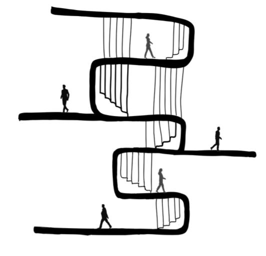 The global decision’s objective is to visually represent the concept as a connecting element within each floor of the building. The main staircase reveals how continous geometry forms can connect different spaces through the inspiration of soundwaves.