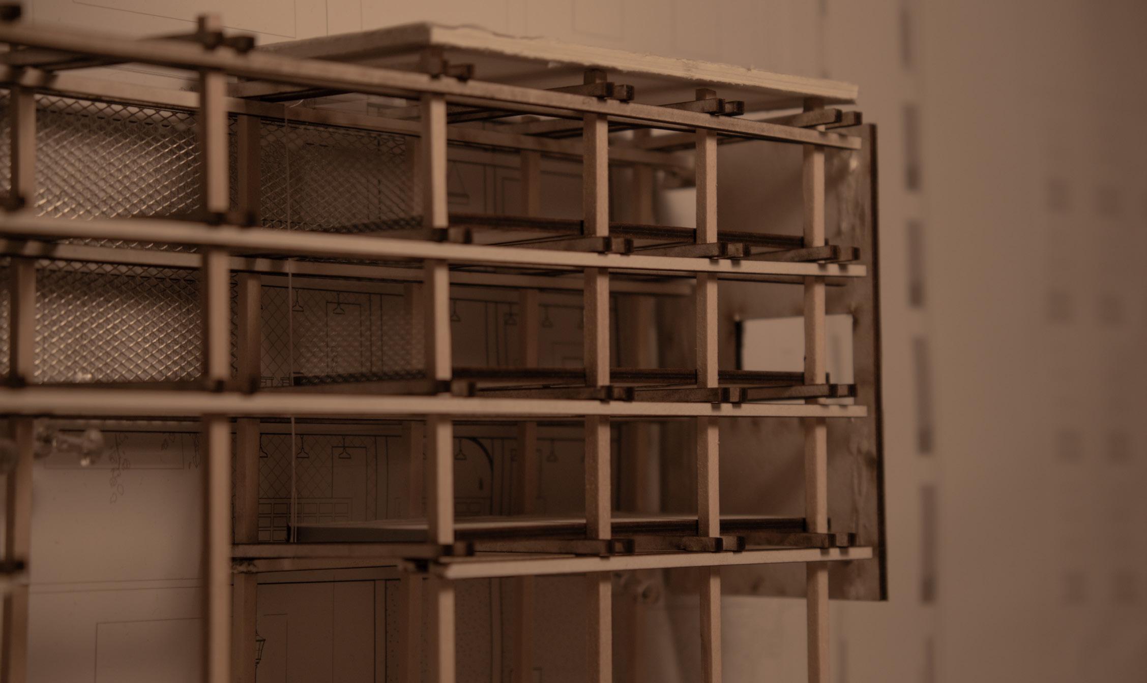 USING DESIGN PRINCIPLES GLEANED FROM THE ANALYSIS OF REI KAWAKUBO’S WORK, A PHYSICAL STUDY MODEL WAS CREATED. IT IS MADE OF BALSA WOOD AND RICE PAPER AND EXPERIMENTS WITH IDEAS OF OPERABILITY AND RESTRICTIVENESS. THIS MODEL EXPLORES MOVEMENT AT DIFFERENT SCALES AND ORIENTATIONS.