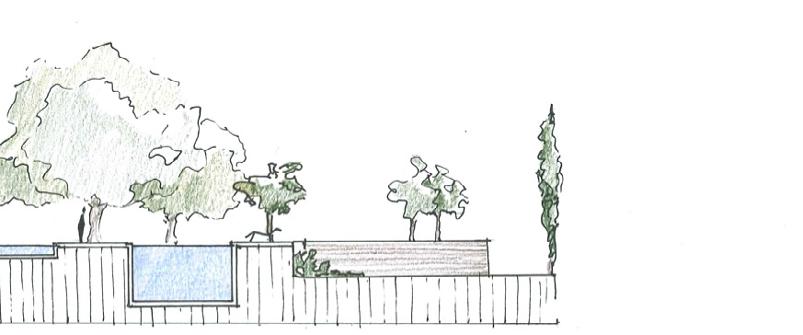 La base en la que se apolla la composición del jardin son distintos caminos que representan las raices, que van uniendo las encinas entre sí, y a su vez las distintas estancias.