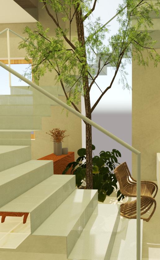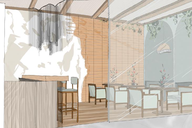 La libertad de los artistas a la hora de interactuar con el espacio es el concepto principal del proyecto, y para ello hemos elegido una estética imperfecta y descarnada, buscando reflejar el desapego a la hora de manchar. Los colores que destacan son el blanco sobre blanco, representando un nuevo lienzo, y son los estudiantes los INTERIORISMO 2022 11 RESIDANCIA DE ARTISTAS
