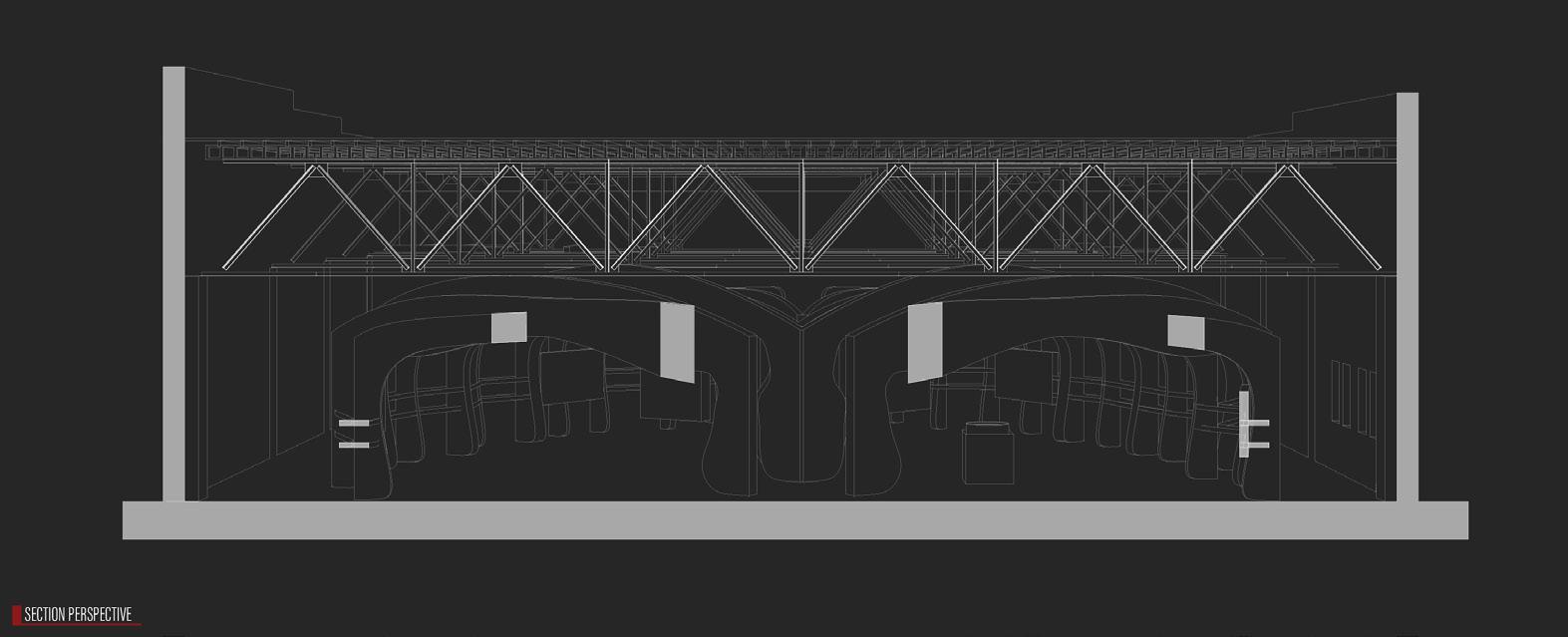 These structured forms created spaces on the interior and exterior using different materials but using the same concept. The interior offered several community spaces and a theatre while the roof provided an exterior gathering space for people to continue to graffiti as a form of expression.