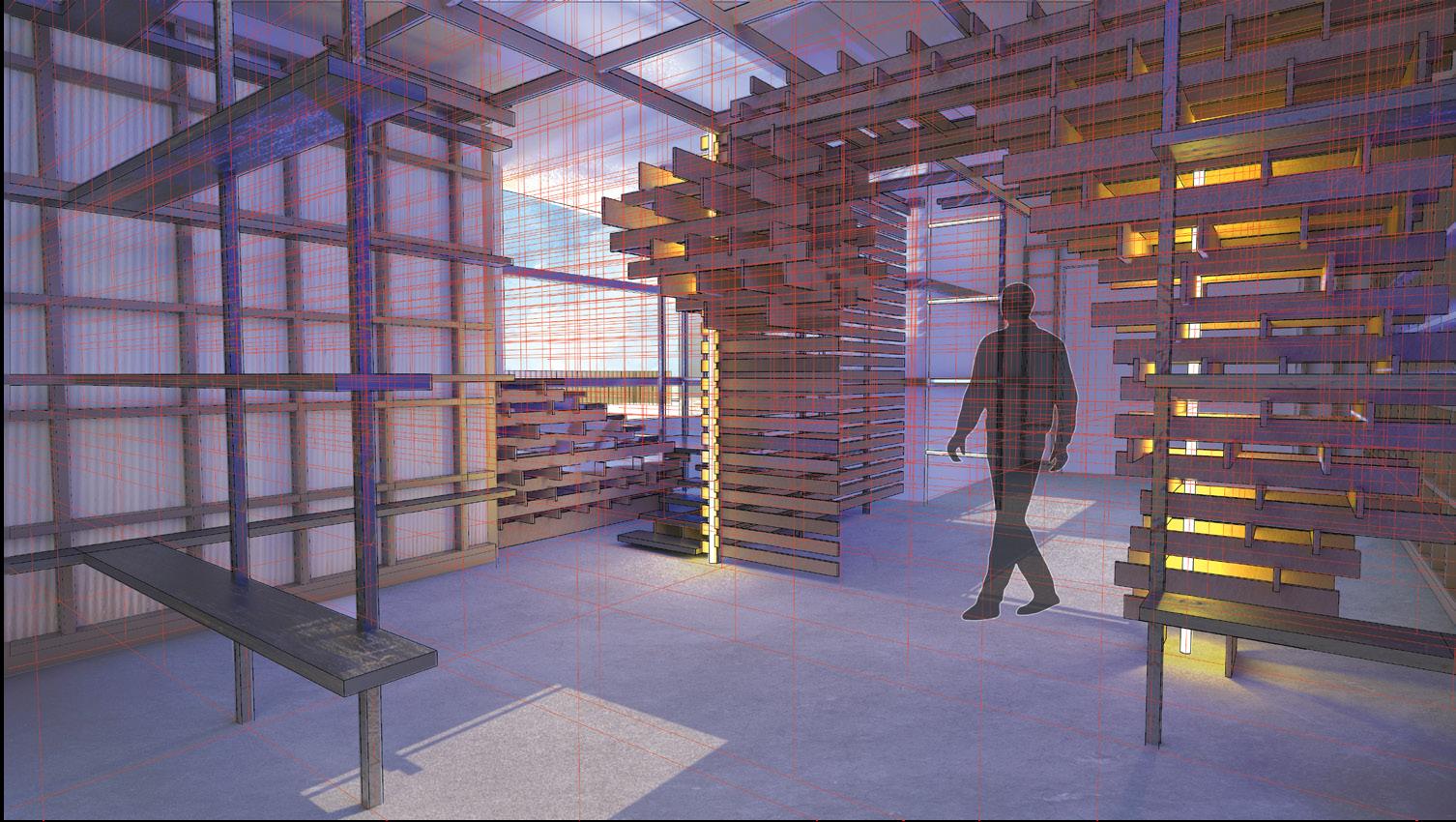 The project began with creating a series of four cubes that focused on different joinery and had unique properties. A grid-like structure was maintained throughout the design of the cubes. After designing my cubes I had the opportunity to travel to Marfa, Texas with my studio where we were able to explore the town in depth and visit Donald Judd’s Chinati Foundation. The project is influenced on my studies of Donald Judd and Dan Flavin’s installations in Marfa. Inspiration was taken from the grid structure in my cube designs and created a two dimensional and three dimensional grid within the site of 1208 W Philadelphia St. This grid was used to create a cohesive structure that bridged the interior and exterior of the observatory as one unified space.