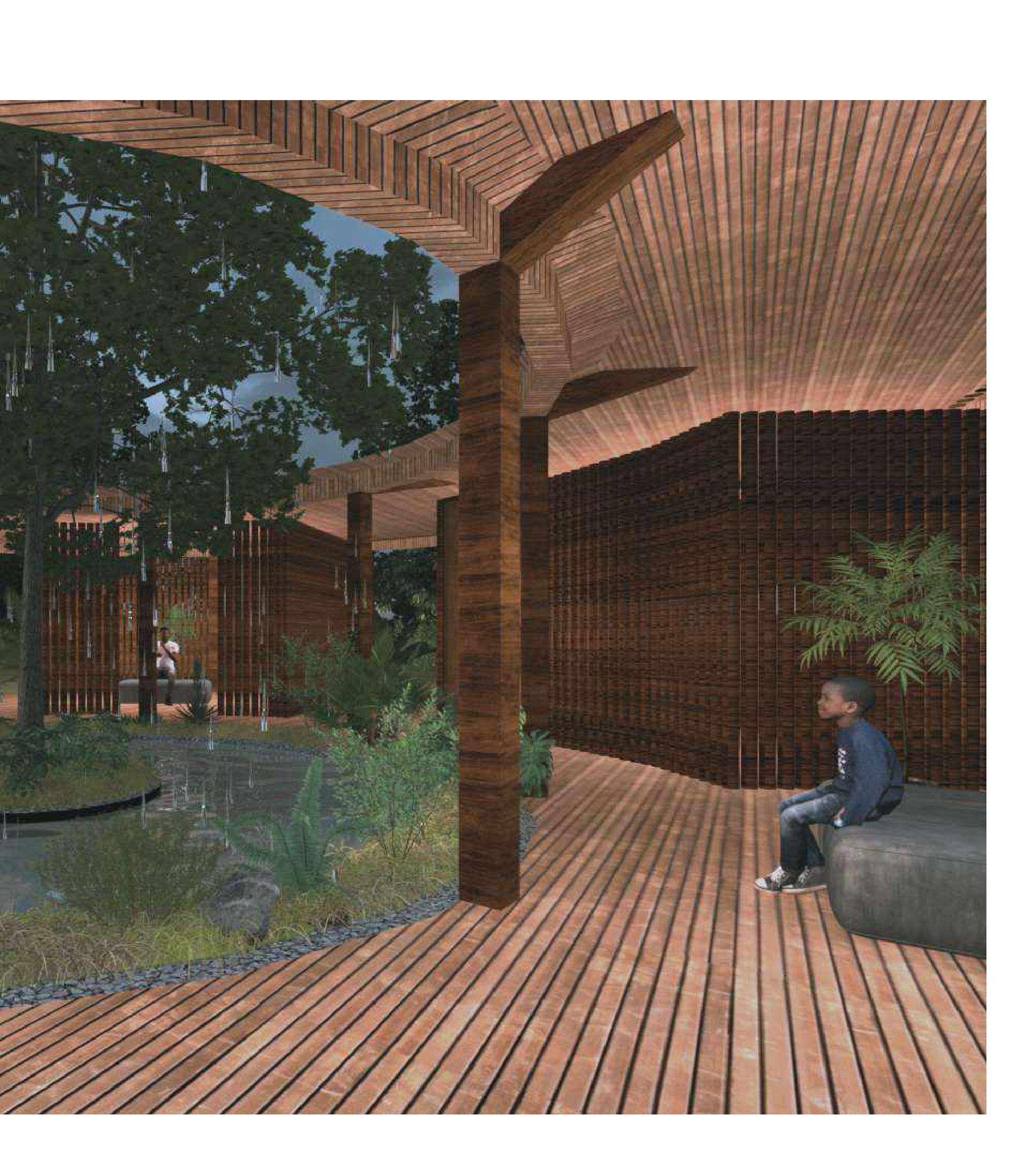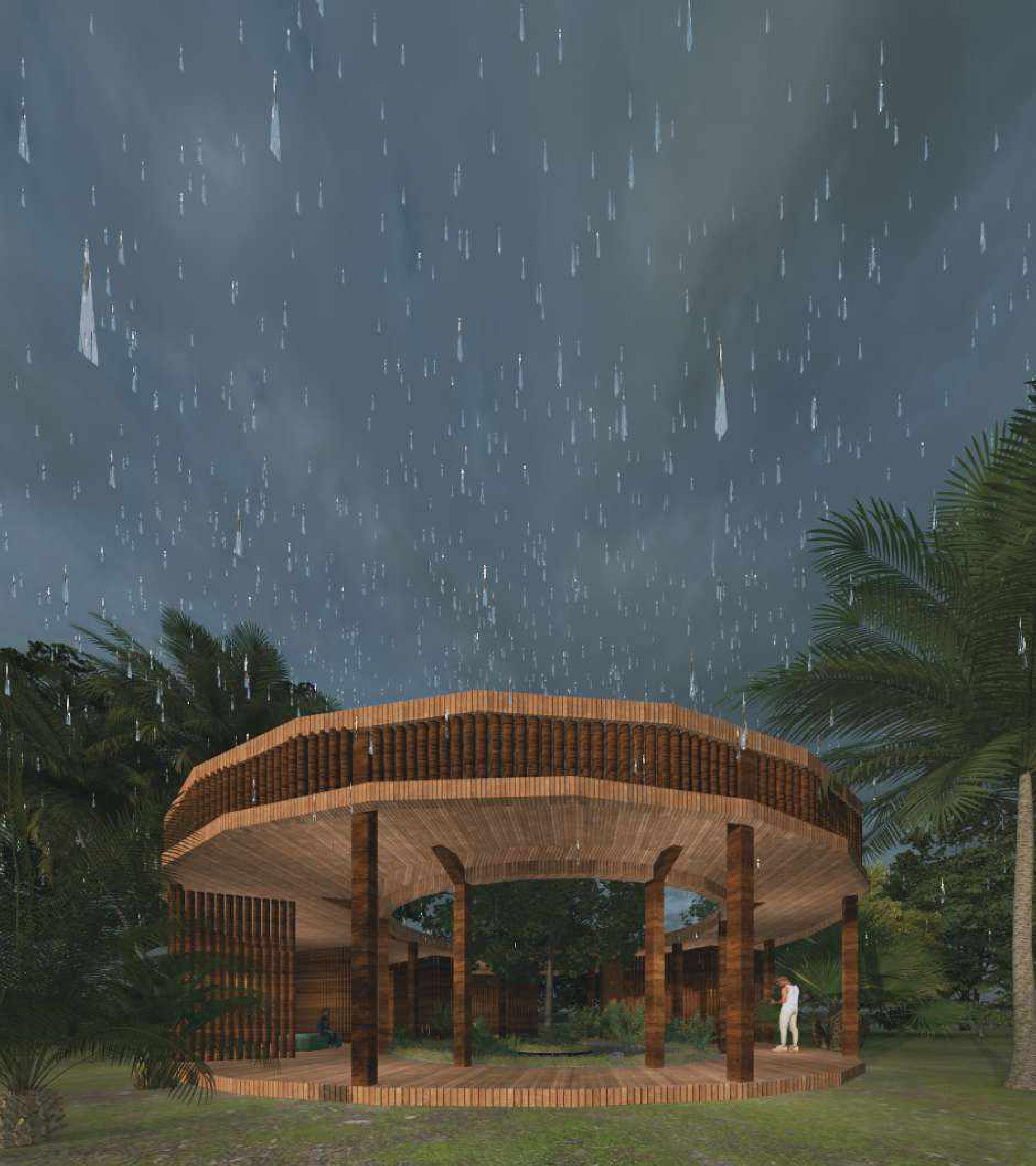 El agua recolectada se canaliza hacia la escuela para que los niños puedan ver sus necesidades satisfechas y disfrutar de condiciones de crianza y desarrollo más pacíficas y mejoradas. El pabellón está construido con madera reciclada, un material abundante en la isla, lo que permite darle una segunda vida y, por lo tanto, reducir su impacto en el territorio.