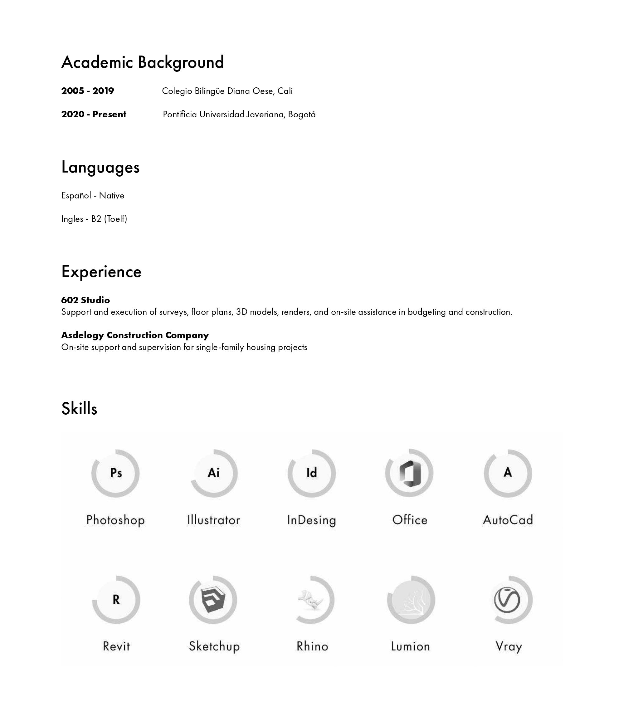 Cuento con capacidades creativas y resolutivas para tareas asignadas, siempre estoy dispuesta a aprender cosas nuevas y a ofrecer lo mejor de mí. Tengo grandes habilidades disciplinarias como responsabilidad, la puntualidad, la comunicación, el trabajo en equipo, la organización y cuento con experiencia en diseño comercial y de vivienda, en obra y urbanismo.