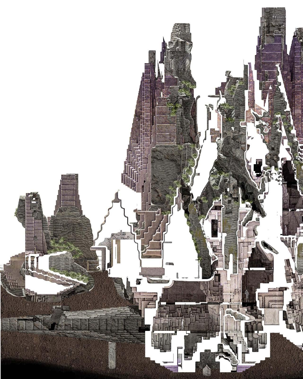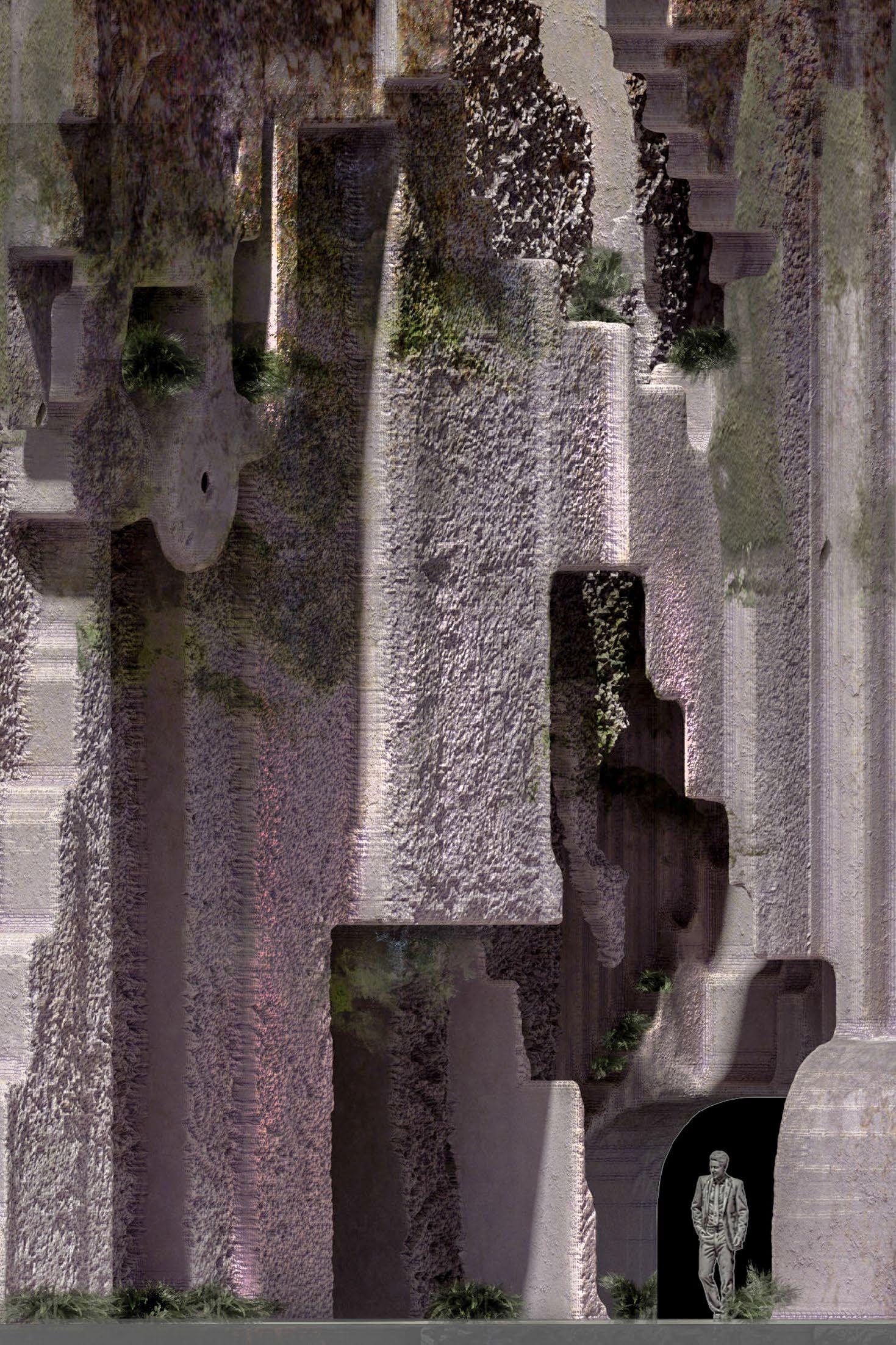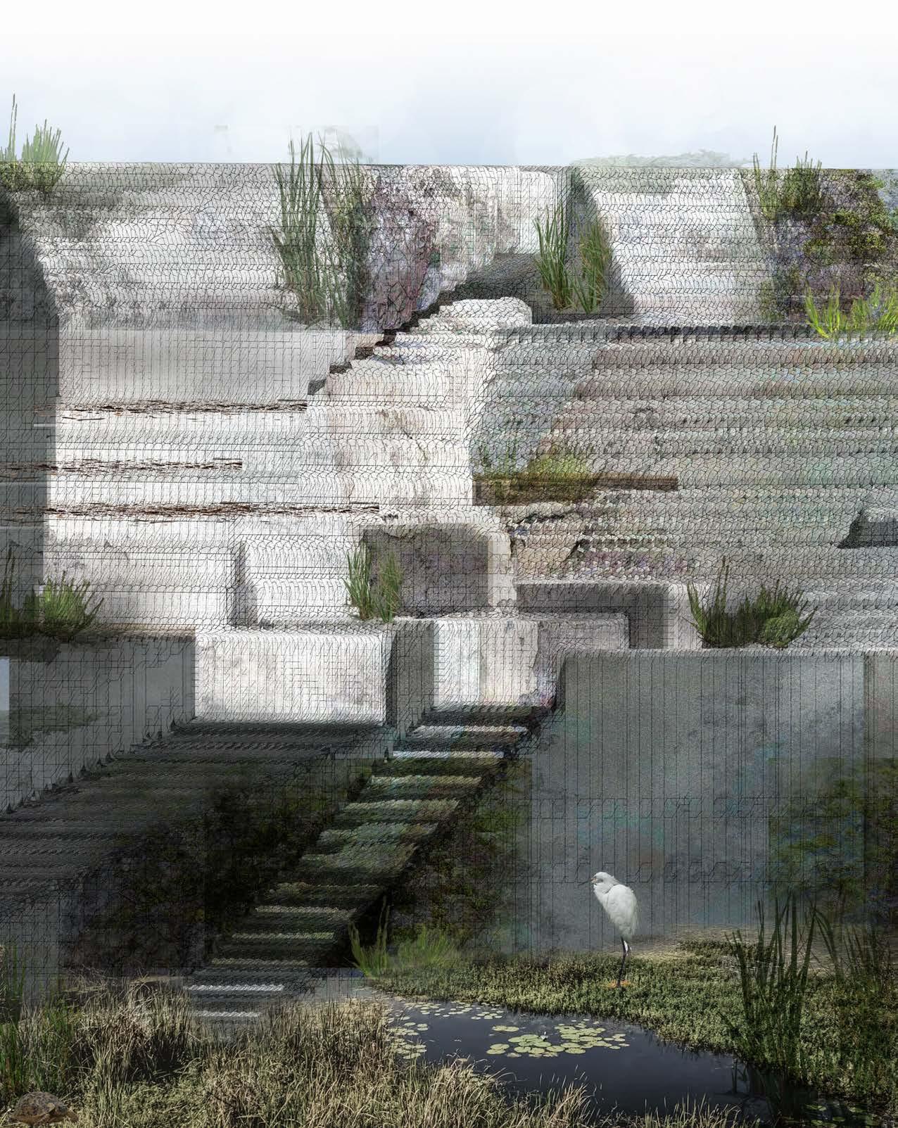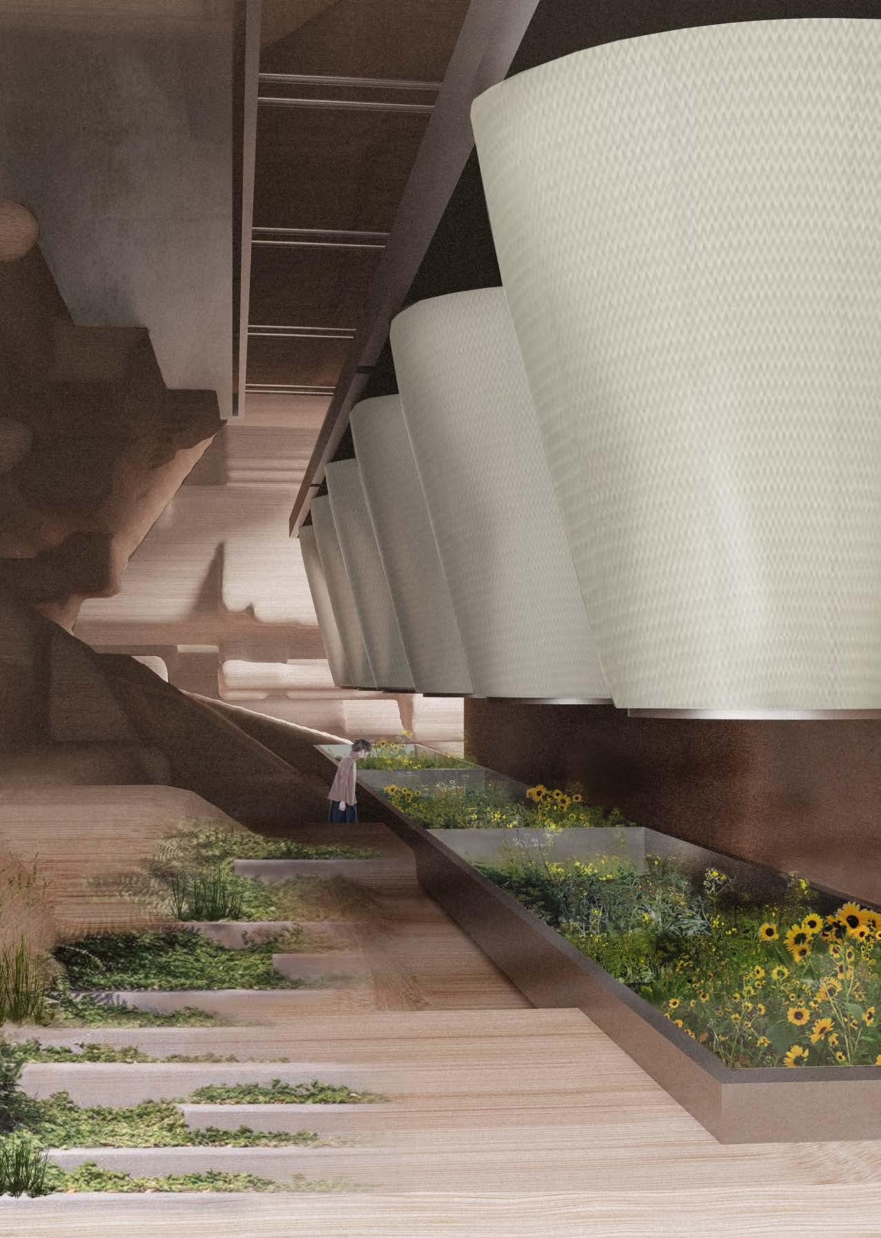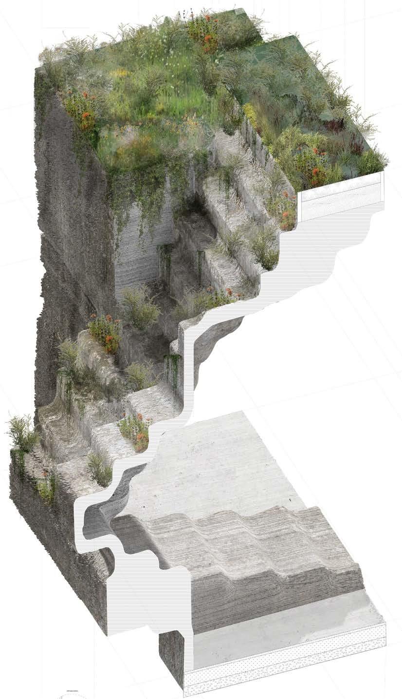 The museum anticipates its eventual reclamation back into the landscape and works with the natural processes of ecological succession by encouraging primary succession organisms, such as moss and lichen, to begin growing in the seams and surfaces of the stepped structure. Natural water filtration wells construct the main exhibition space of the museum, which also serve to provide clean water for plant propogation and consumption from site occupants.