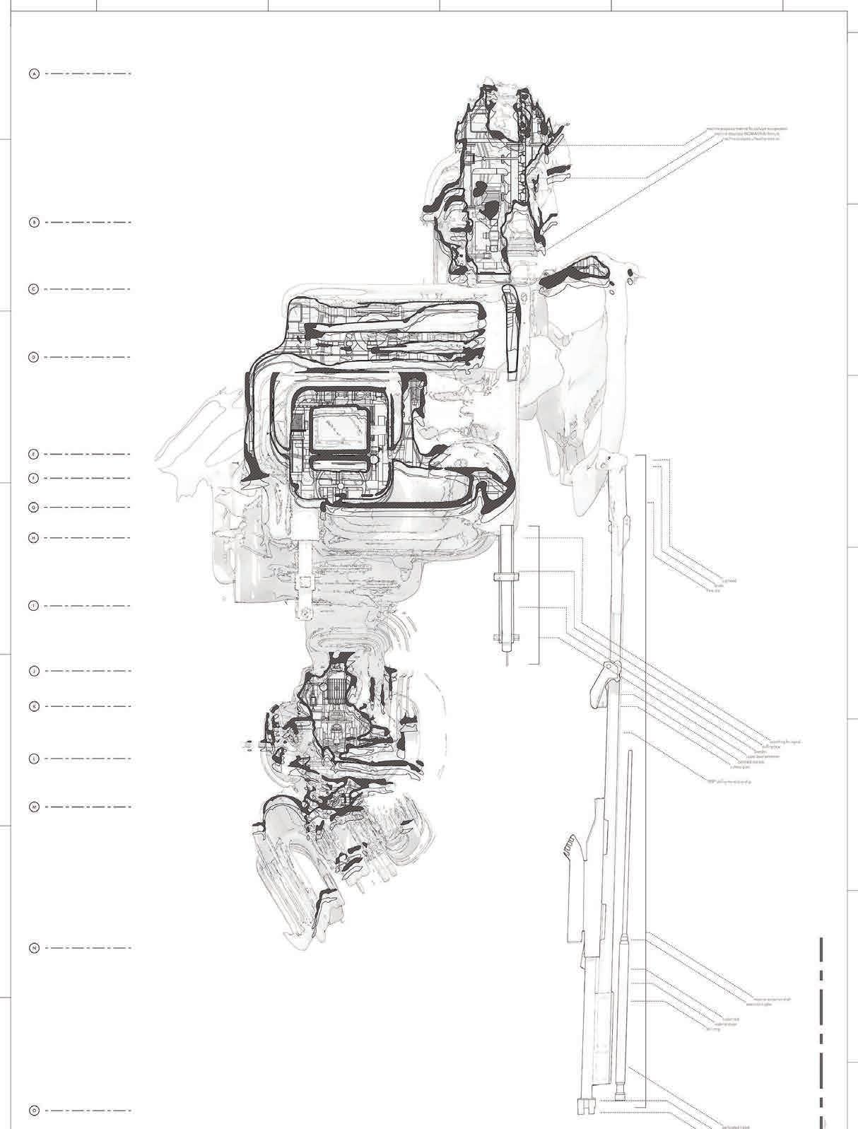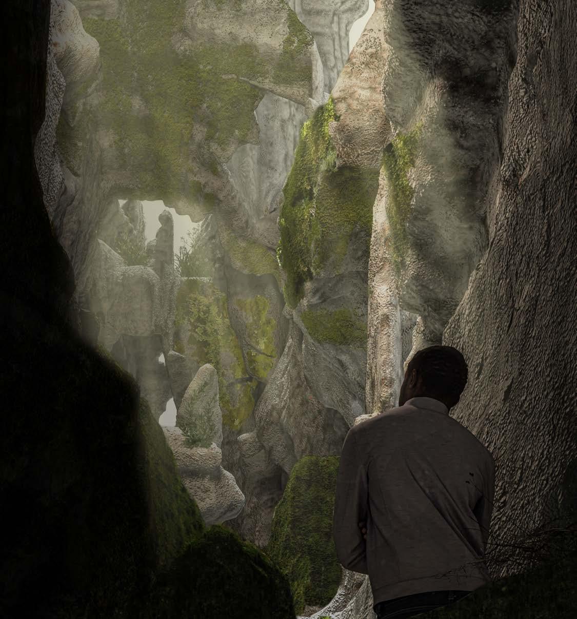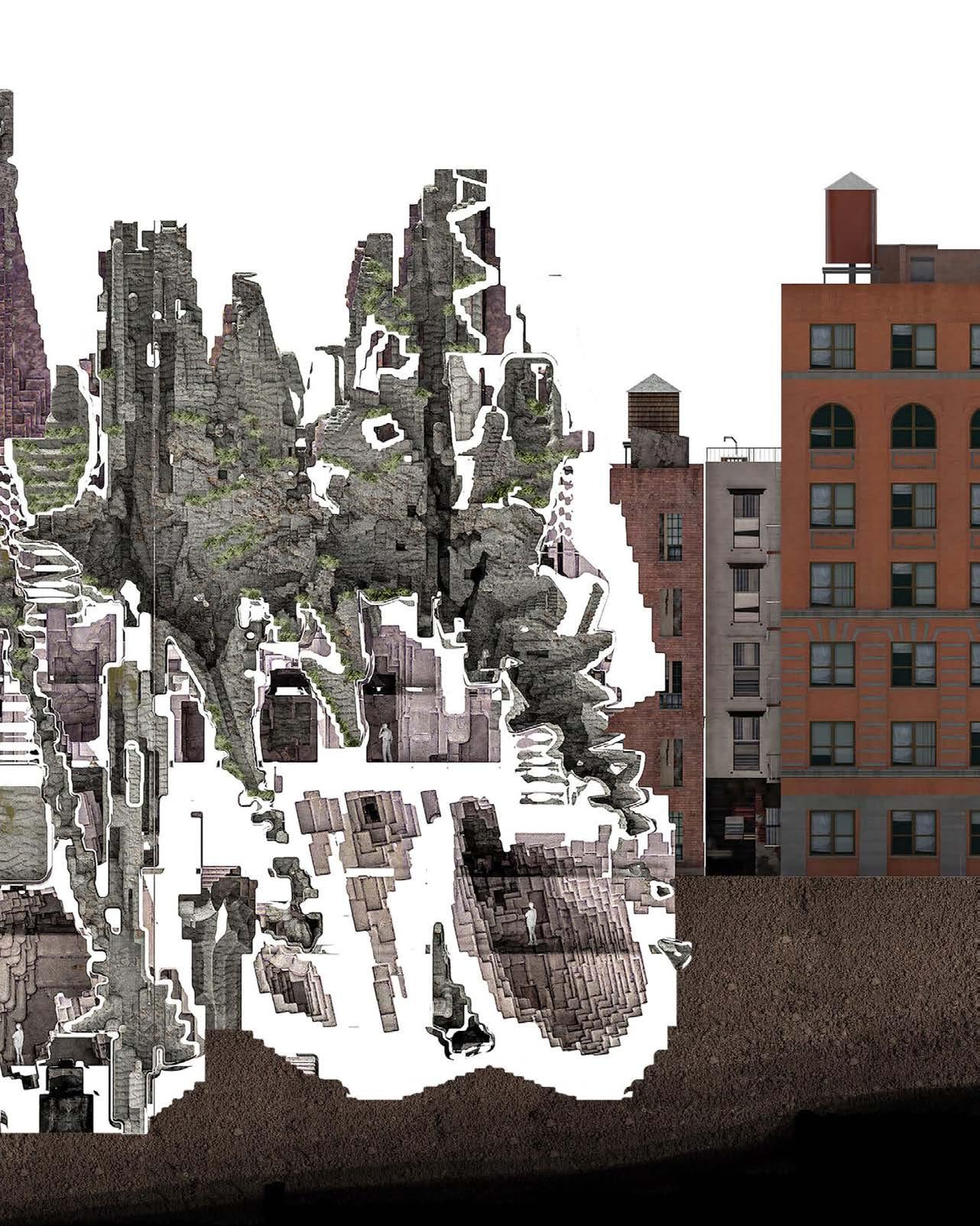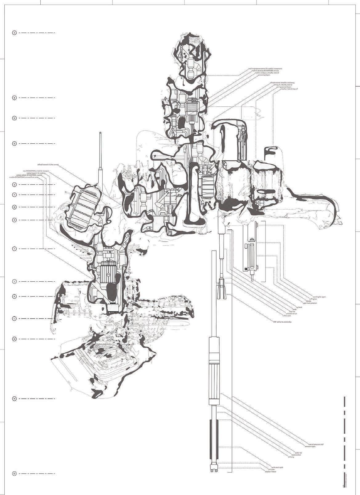 The museum anticipates its eventual reclamation back into the landscape and works with the natural processes of ecological succession by encouraging primary succession organisms, such as moss and lichen, to begin growing in the seams and surfaces of the stepped structure. Natural water filtration wells construct the main exhibition space of the museum, which also serve to provide clean water for plant propogation and consumption from site occupants.