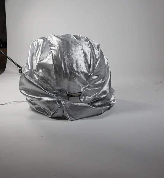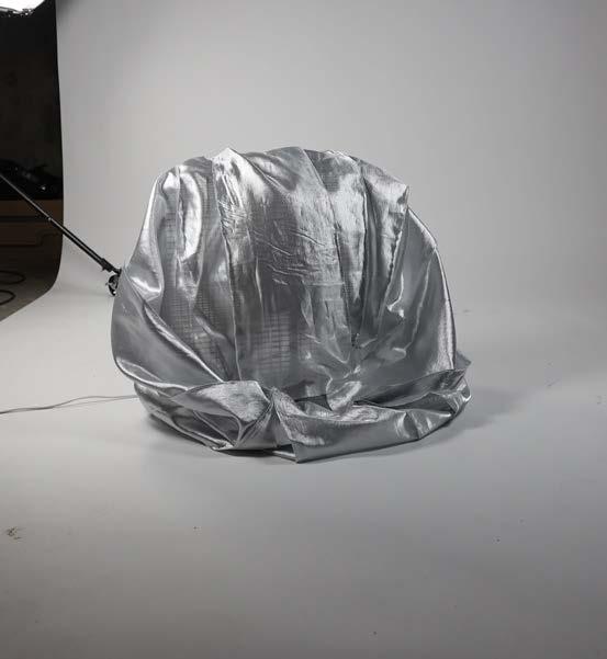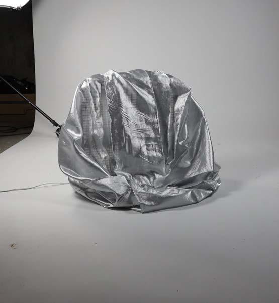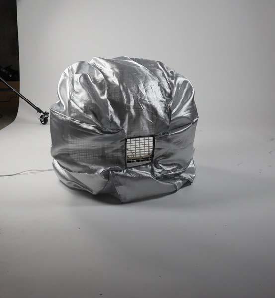 This project intervenes on a typical box fan. One large piece of fabric was folded, pleated, and hemmed to create a mini inflatable enclosure. After material tests with cotton and waterproof fabric, aluminum was chosen for the final product for its reflective and transparant properties.