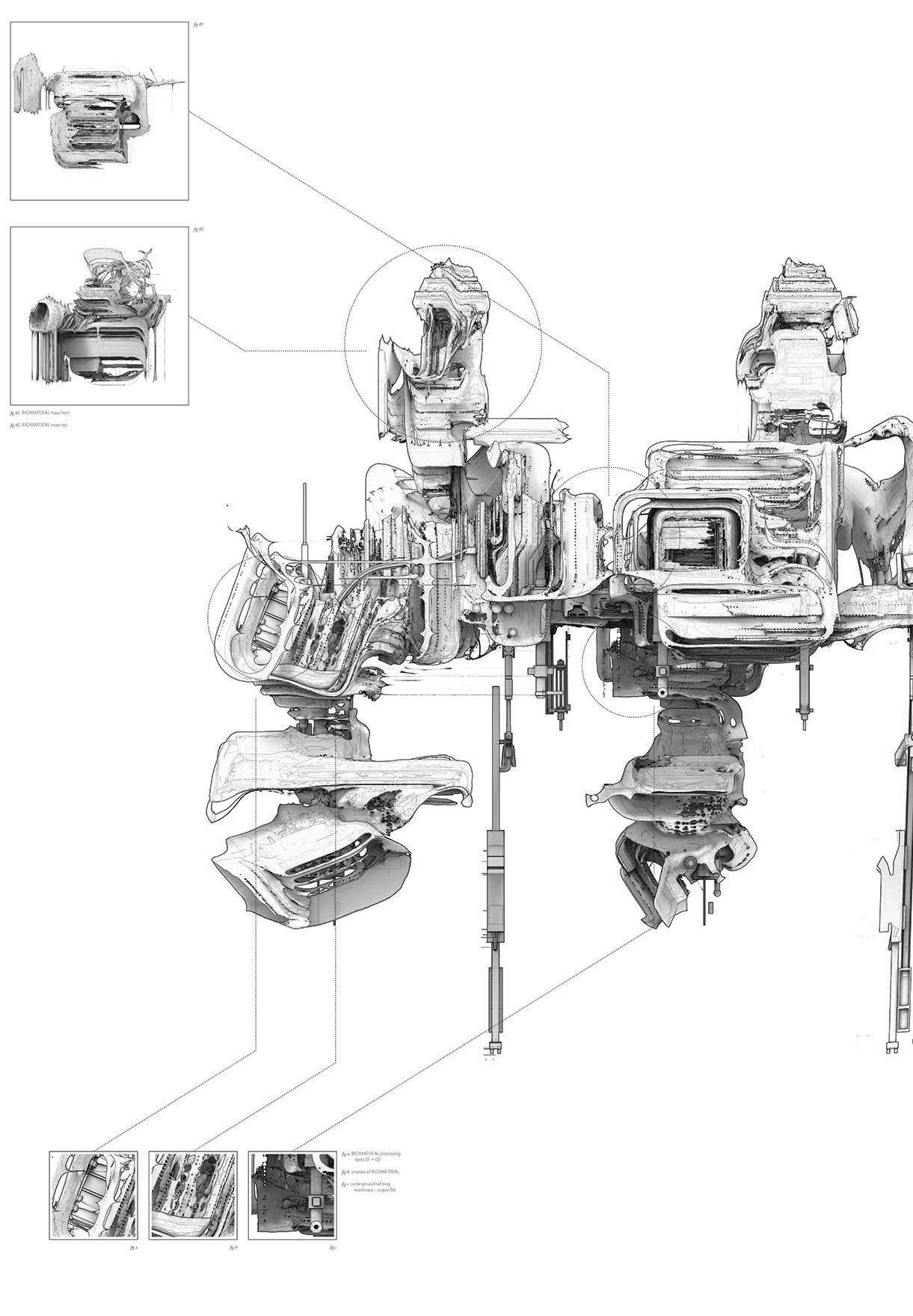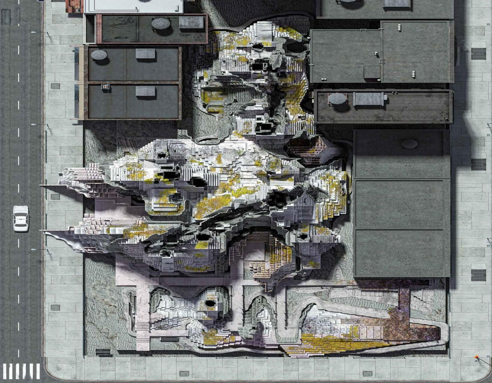 EXISTING EXCAVATE CRUSH RE PURPOSE REASSEMBLE PRIMARY SUCCESSION RE MEDIATE / BASE CONC BEDROCK ORGANIC MATERIAL MINERAL/ HUMUS UNDERLYING PARENT MATERIAL ( GLACIAL DEPOSITS AND DEBRIS) Lorem ipsum dolor sit amet, consectetuer adipiscing elit, sed diam nonummy nibh euismod Lorem ipsum dolor sit amet, consectetuer adipiscing elit, sed diam nonummy nibh euismod Lorem ipsum dolor sit amet, consectetuer adipiscing elit, sed diam nonummy nibh euismod Lorem ipsum dolor sit amet, consectetuer adipiscing elit, sed diam nonummy nibh euismod TOPSOIL WEATHERED SOIL MATERIAL UNDERLYING PARENT MATERIAL ( GLACIAL DEPOSITS AND DEBRIS) VV IDENTIFY // concrete parking area and building foundation concrete from parking area is removed portable concrete compacter is positioned on site // concrete is pulverized and set aside // concrete is broken into planks and set aside concrete is ground down further and used as tiny aggregate in 3d printing material concrete is reassembled through large scale 3d prinint, and assembling of structural debris pieces around the site Fixation of the sediment by blue-green colonization starts with unicellular algae together by production of mucus. This substrate. PHYTOREMEDIATON Museum of Remediation: Individual Project