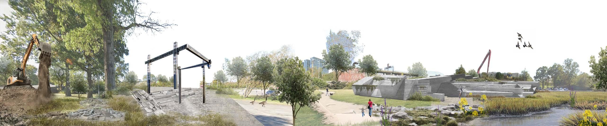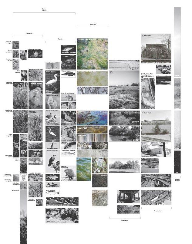 RE PURPOSE REASSEMBLE PRIMARY SUCCESSION RE MEDIATE / RE INTRODUCE EXHIBIT INHABIT SECONDARY SUCCESSION CLIMAX COMMUNITY concrete is ground down further and used as tiny aggregate in 3d printing material concrete is reassembled through large scale 3d prinint, and assembling of structural debris pieces around the site Fixation of the sediment by blue-green and green algae. The mudflat colonization starts with unicellular algae such as diatoms sticking the sand together by production of mucus. This causes a brownish biofilm on the substrate. A next stage is the germination of species such as the glasswort Salicornia. The seeds germinate after partial desalination of the soil by rain. Sedimentation between and around the glassworts contributes to elevating and stabilizing the substrate. PHYTOREMEDIATON BIOREMEDIATON Cornell : Spring 2022