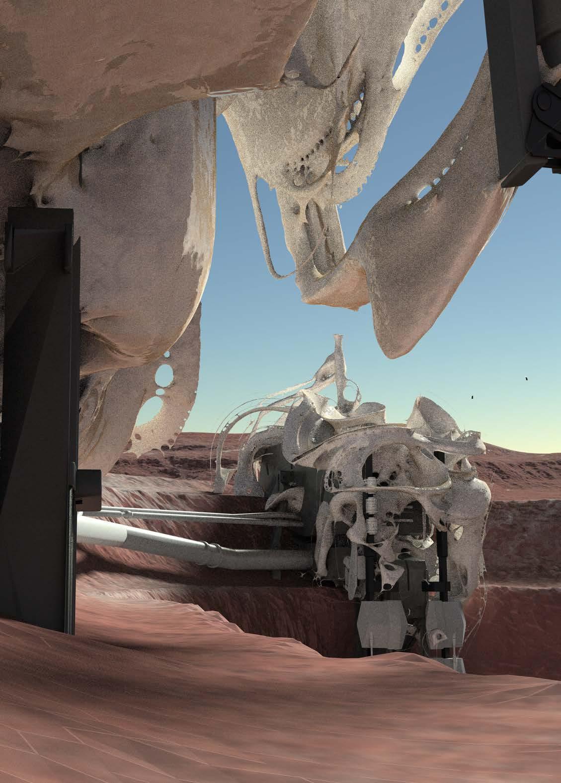 This project is an exploration of post-singularity and its post-anthropocentric ecology. The post-singular reality we express exists once the machine exceeds beyond the author’s intent. By assuming that the essence of being is to create, consciousness is found when the machine begins to produce something on its own, non-human, agenda. In this case, the result is a new synthetic biological life formed through molecular reconstruction. Both organic and inorganic materials are taken from the environment and remodeled in a process of continued self production.
