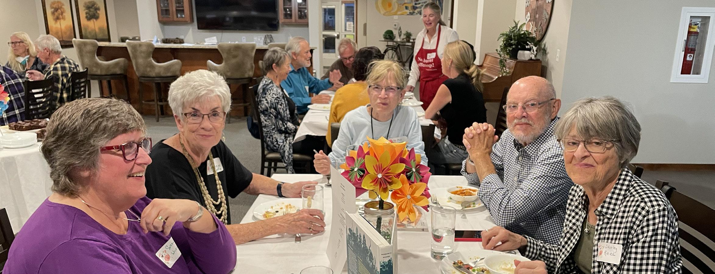 Dinners for 7 is a fellowship program intended to build connections among adults through sharing a meal. Participants are organized into groups of seven to meet three times on a potluck basis at homes, rotating hosting duties, with the host providing an entrée and others providing salad or dessert, or any other format that works for that particular group. Or they can meet for breakfast or lunch, or at a restaurant. Next registration is in January 2025.