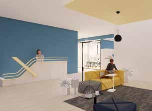Finishes and furniture in the palette tie to the exciting but technological colors of yellow and blue, two colors that can both create tranquility and excitement in different scenarios.