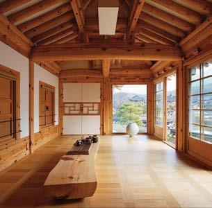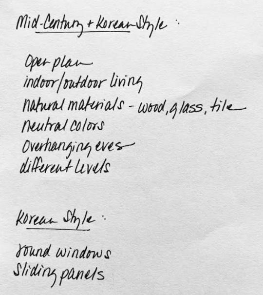 The Smith-Lee’s desire an attractive, well-designed home that accommodates universal design and agingin-place concepts. They would like a dedicated home office and a comfortable guest space for long term visitors, including Ms. Lee’s elderly mother. For their personal bedroom suite, they would like a minimum of 100 sq ft for their bathroom and they would like a closet that can accommodate at least 12 feet of hanging space. They also wish to have a dedicated space for their exercise bike. Ms. Lee collects teapots and would like to have a space to display them. The couple loves to cook so the kitchen should be a highlight within the design. The couple are avid gardeners, so the design focus is on natural materials and indoor/outdoor living, optimized for the changeable Pacific Northwest climate. The design concept is: a contemporary reinterpretation blending Mid-century Modern with the traditional Korean “Hanok” house. The design is intended to honor Ms. Lee’s Korean heritage and to enhance the couple’s active retirement lifestyle. INSPIRATION