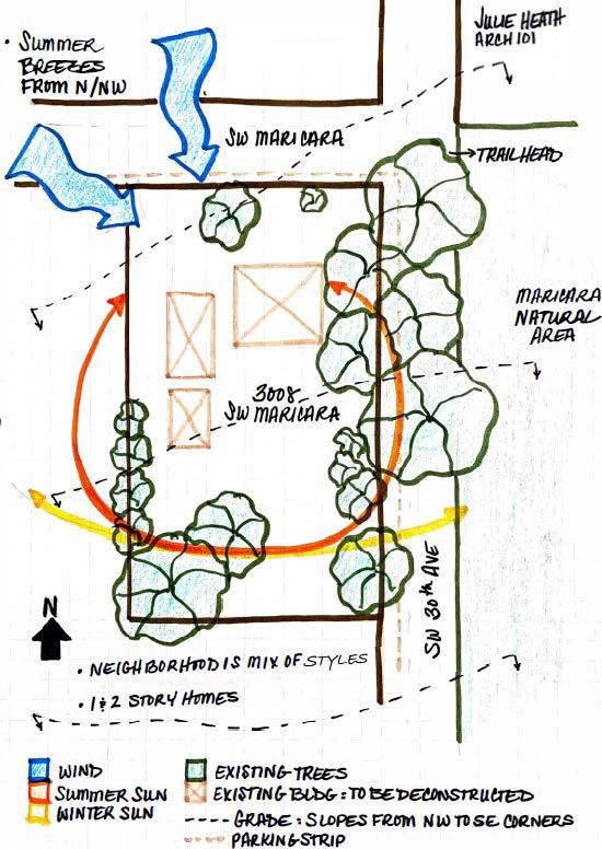 XXXX SW Maricara Street in Portland, Oregon is a corner lot in a quiet residential neighborhood with a mix of architectual styles. Across from the property, on SW 30th Avenue, is the Maricara Natural Area. There is an existing 1947 ranch house and a pair of small garages currently on the property. The owners plan to deconstruct the existing structures and replace them with a duplex. Each unit must be less than 1200 sq ft and include a one-car-garage. Care should be taken to retain existing trees wherever possible.