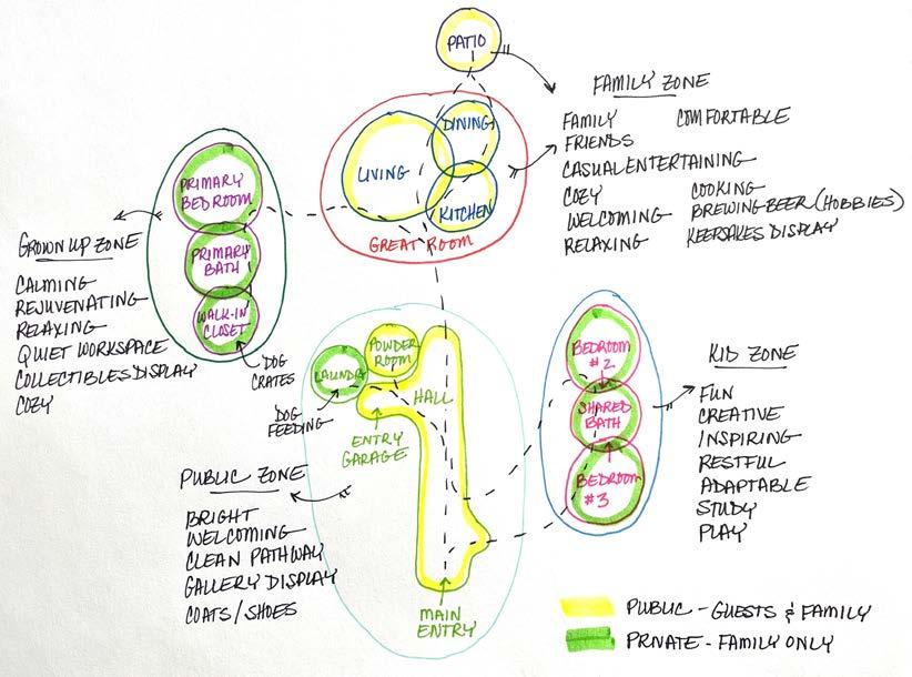 Brittany and Sean Giles are in their early thirties. They have an eight-yearold daughter named Addison, and a six-year-old daughter named Emma. The family also has two dogs, a golden retriever and a German short-haired pointer. They recently moved into their newly built home and are looking for help making it feel warm and inviting instead of builder-white and echoing as it mostly is now. Brittany’s style is contemporary eclectic. Sean prefers a more traditional Craftsman style. They both like earth tones, blues, purple, black, and white. They plan to stay in the house at least until both of their girls graduate from high school. They enjoy cooking and informal entertaining for family and friends a few times a month. Sean is a hobbyist beer brewer. Brittany collects Disney memorabilia and has a large collection of Minnie-Mouse ears she would like to display in the Primary Bedroom. Addison’s favorite colors are red and white, and she loves Dalmatians. Emma’s favorite colors are pink and purple, and she loves unicorns. Brittany loves soaking in the jetted tub and would like a TV in the Primary Bath if possible.